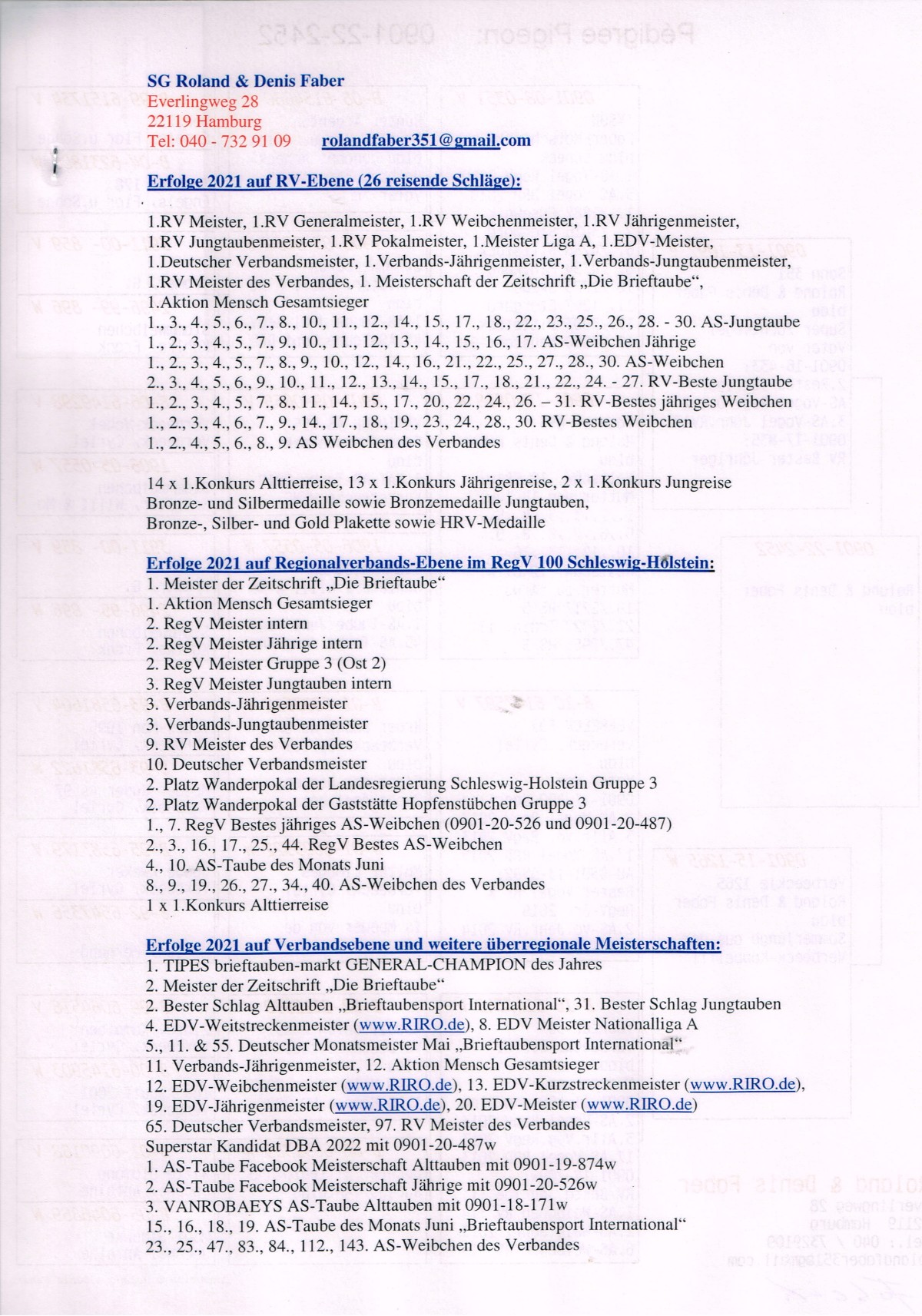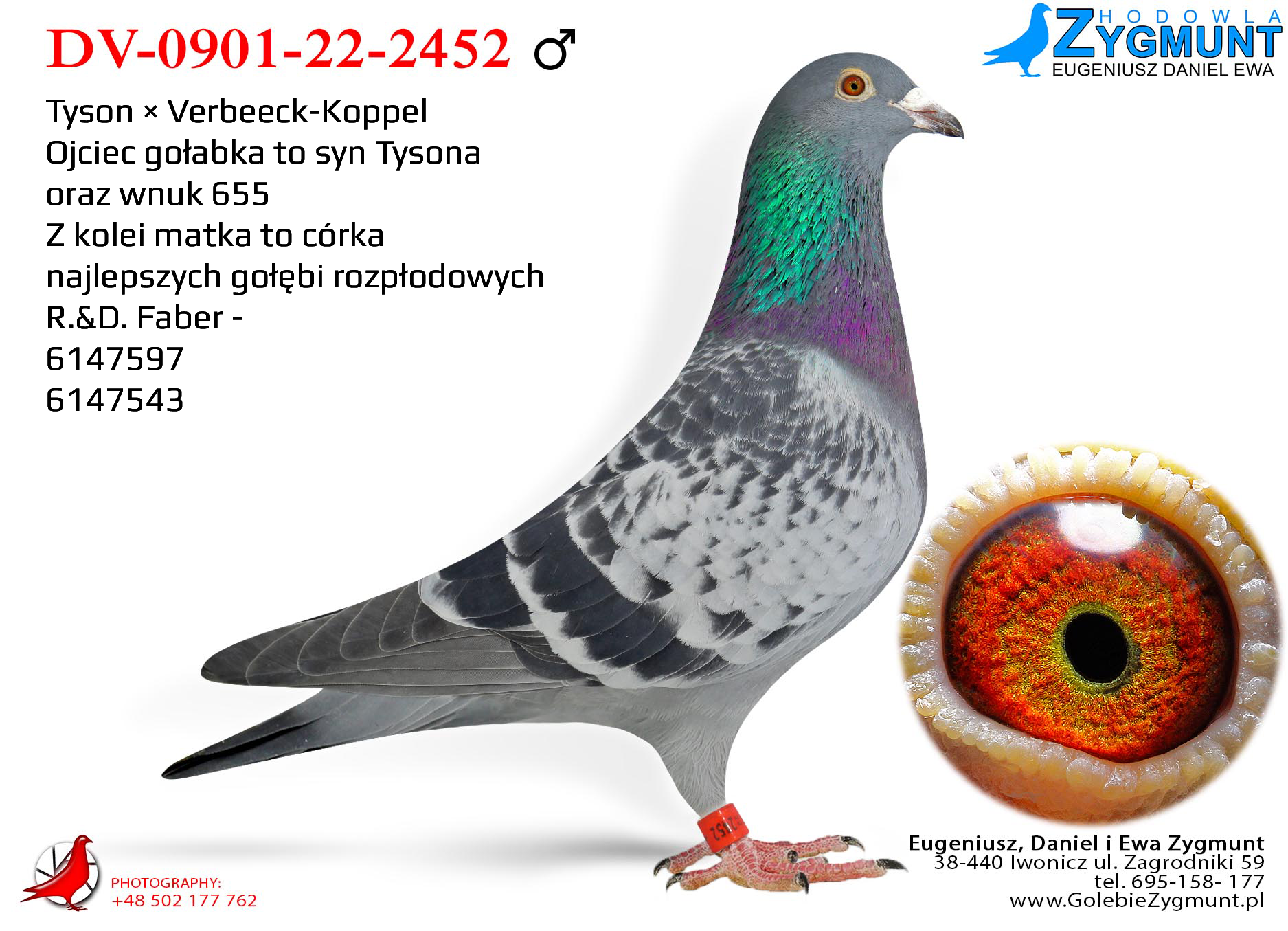 Gołąb o wyjątkowym pochodzeniu, dający potomstwo o sile i inteligencji lotowej. ***Transport: do 2 sztuk – 100 zł, 3–4 sztuki – 150 zł, powyżej 5 sztuk – 200 zł---Sezon 2025 przyniósł kolejne świetne wyniki – zdobyliśmy 4. i 5. miejsce w oddziale oraz tytuł II vice-mistrza oddziału w kategoriach MP oraz kat-A. Na wspólnych gołębnikach nasze ptaki pokazały klasę: 3. miejsce w finale WG Zatoka Puck, 7. AS WG Zatoka Puck, 36. AS OLR SuperCup, 33. i 86. AS OLR Mazury oraz 11. miejsce drużynowo na WG Zatoka Puck. Poprzedni sezon 2024 był jednym z najlepszych w naszej historii – 1., 3. i 4. miejsce w oddziale to wynik, jakiego jeszcze nie było. Do tego 1. i 2. miejsce w kat. MP oraz 1. w kat. A. Sezon zakończyliśmy z 9 gołębiami z 6 konkursami (w tym 5 pierwszych w oddziale) i aż 86 gołębiami z ponad 4 konkursami. Na wspólnych gołębnikach również liczne sukcesy: 2. z finału OLR Mazury, 16. z Ekstra Finału WG Zatoka Puck, 12. z MWG Rogowo, 2. z WG Zatoka Puck, 70. z finału MWG Rogowo, 43. AS Rogowo, 55. z finału OLR SuperCup, 36. AS WG Podhale, a gołąb po naszym samcu zdobył 2. miejsce w finale OLR SuperCup. Więcej informacji w rodowodach lub pod numerem telefonu 783 265 592.