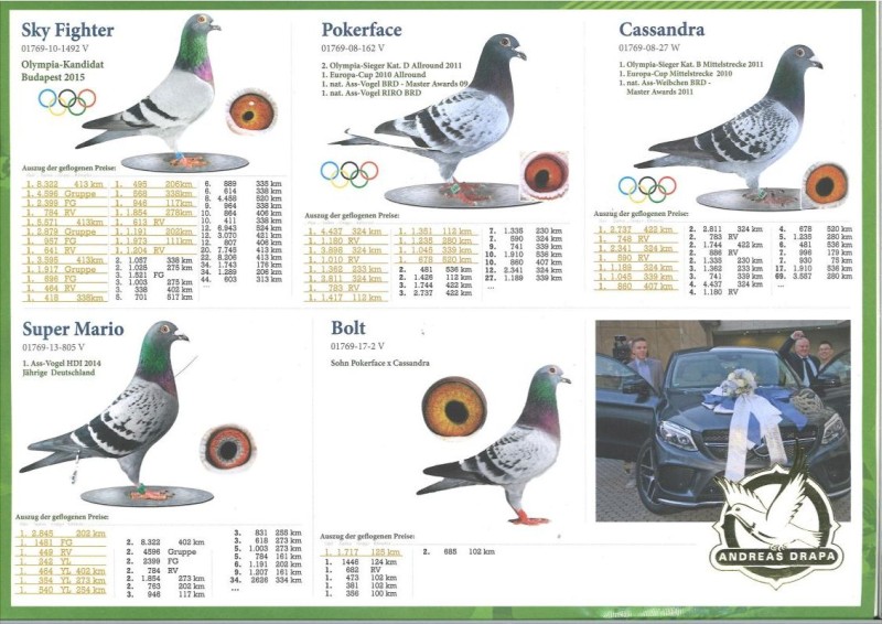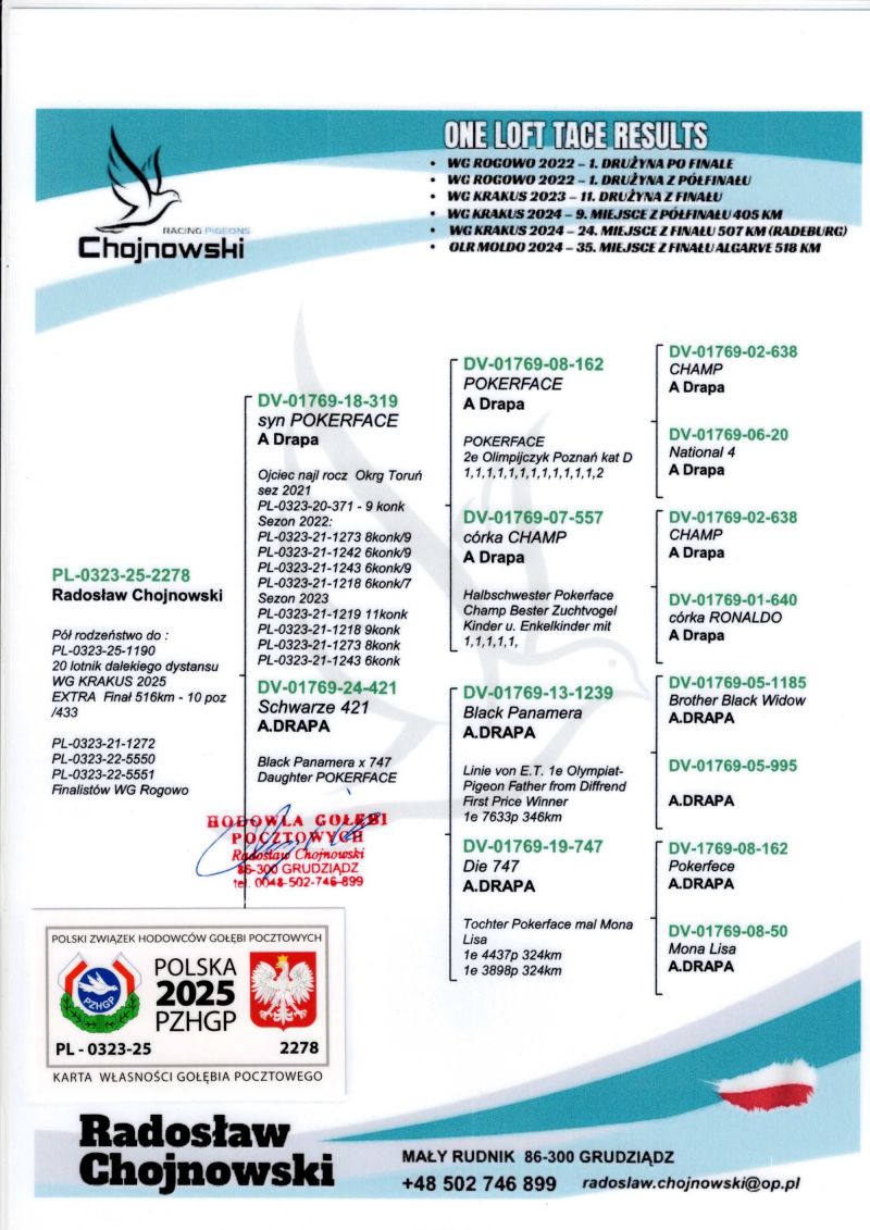 Ojciec oferowanego gołębia to SUPER 319 najlepszy gołąb rozpłodowy na mojej hodowli syn POKERFACE, matka to córka BLACK PANAMERA z hodowli A.Drapa. Oferowany gołąb to prawdopodobnie SAMCZYK. Koszt transportu 100 zł .Gołąb wychowany z boksu indywidualnego