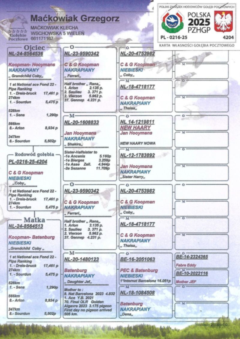 PL-0216-25-4204 Inbred Coby Koopman 1 National Ace 22 Pipa Ranking