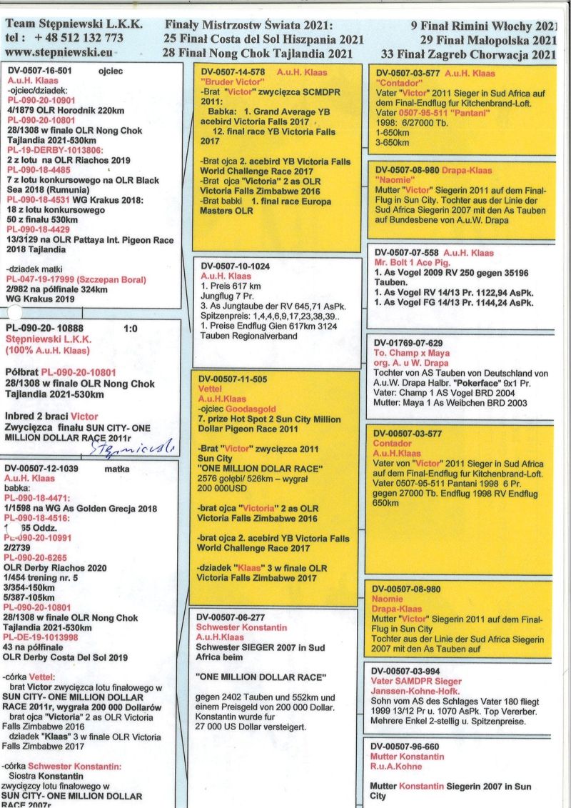 Samiec o nienagannej, mocnej budowie. Wywodzący się z najlepszych gołębi Klaasa - zwycięzców na SAMDPR w RPA. Transport do uzgodnienia.