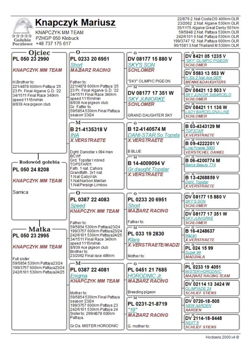Ojcem gołębia jest inb. Sky bazowy samiec, który jest dziadkiem do wszystkich naszych"Patajców" super uparte gołębie, które już jako 7 miesięczne robią 500-600km.Matką jest Pełna siostra "Pattaya Sky Power"Gołębie z naszej hodowli biorą udział w rywalizują na najwyższym światowym poziome, z najlepszymi hodowlami na świecie! Więcej szczegółowych informacji na tel.