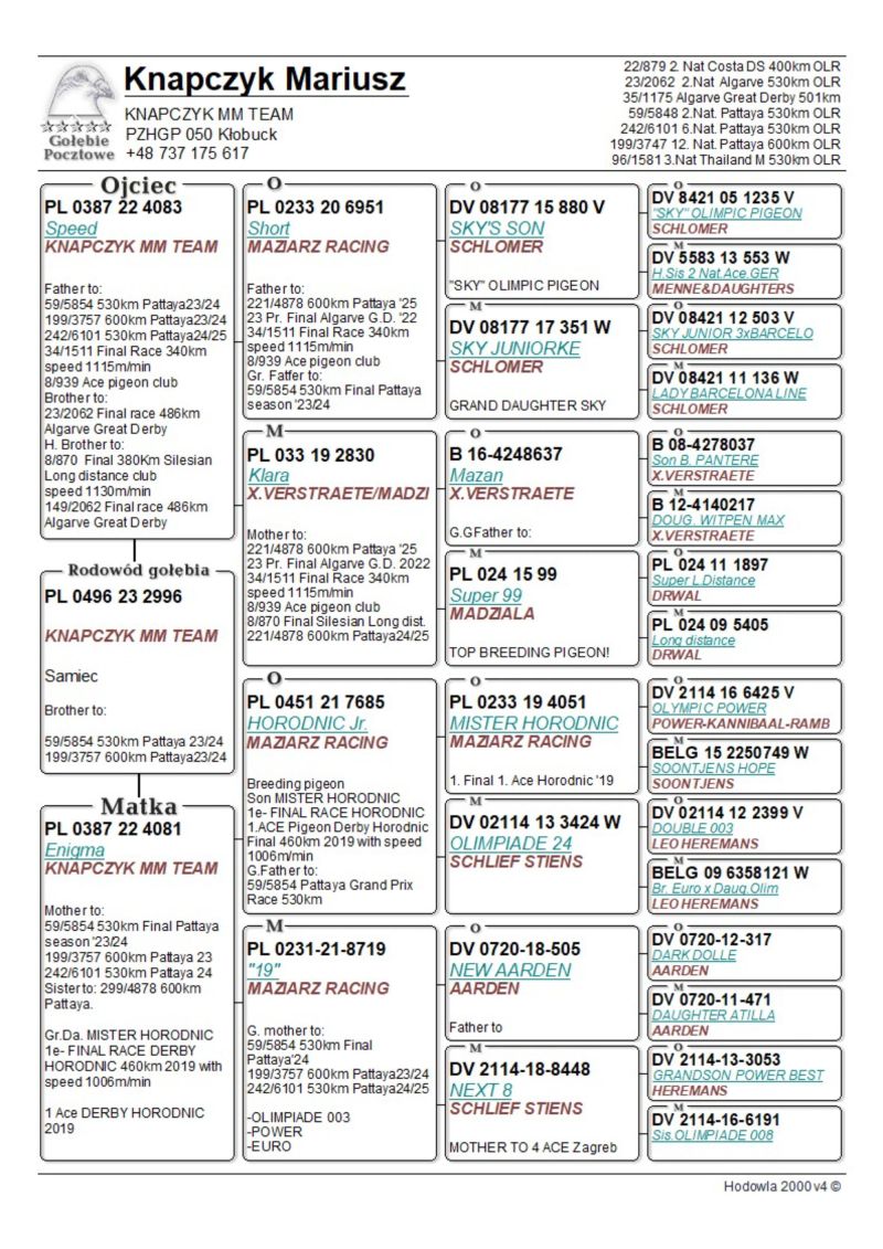 Jest to pełny brat finalisty w Pattaya który zajął 59/5854 a z polskich gołębi był 2. Pełna siostra poszła jeszcze na Extra Finał 600km i zajęła 199/3757 i była 12 z Polskich gołębi. W sezonie 24/25 następny brat zajął 241/6101. Samiczek nie ma dostępnych. Rodzice tych gołębi były lotowane w oddziale, samczyk został 7 lotnikiem w Kłobucku. Możliwe DNA. Więcej informacji na tel.