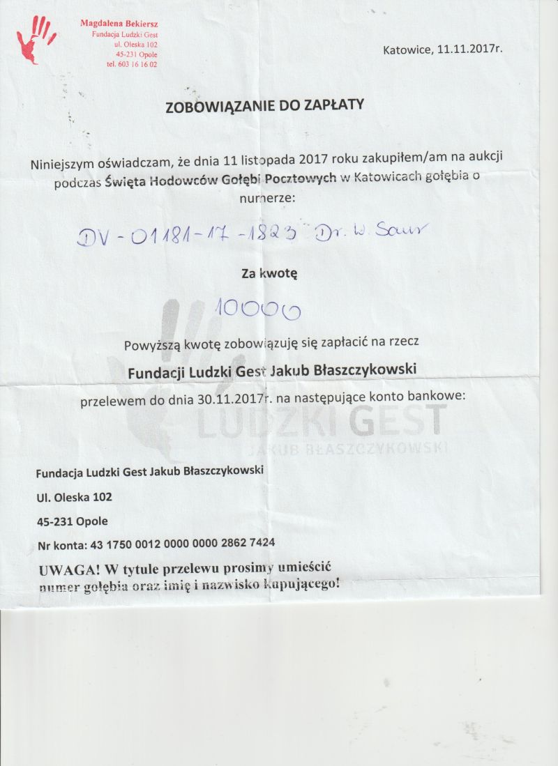 RyGINALNY GOŁĄB Z HODOWOLI DR.W.SAUR . SAMICA ZAKUPIONA NA AUKCI "LUDZKI GEST" ZA KWOTĘ 10.000 TY ZŁ . JEST TO WNUCZKA "Den AD".GOŁĄB W 100% PŁODNY .GOŁĄB W TRAKCIE PIERZENIA ,SZCZEGÓŁY POCHODZENIA W RODOWODZIE . ODBIÓR OSOBISTY LUB TRANSPORT 150ZŁ . KONTAKT 880-577-297