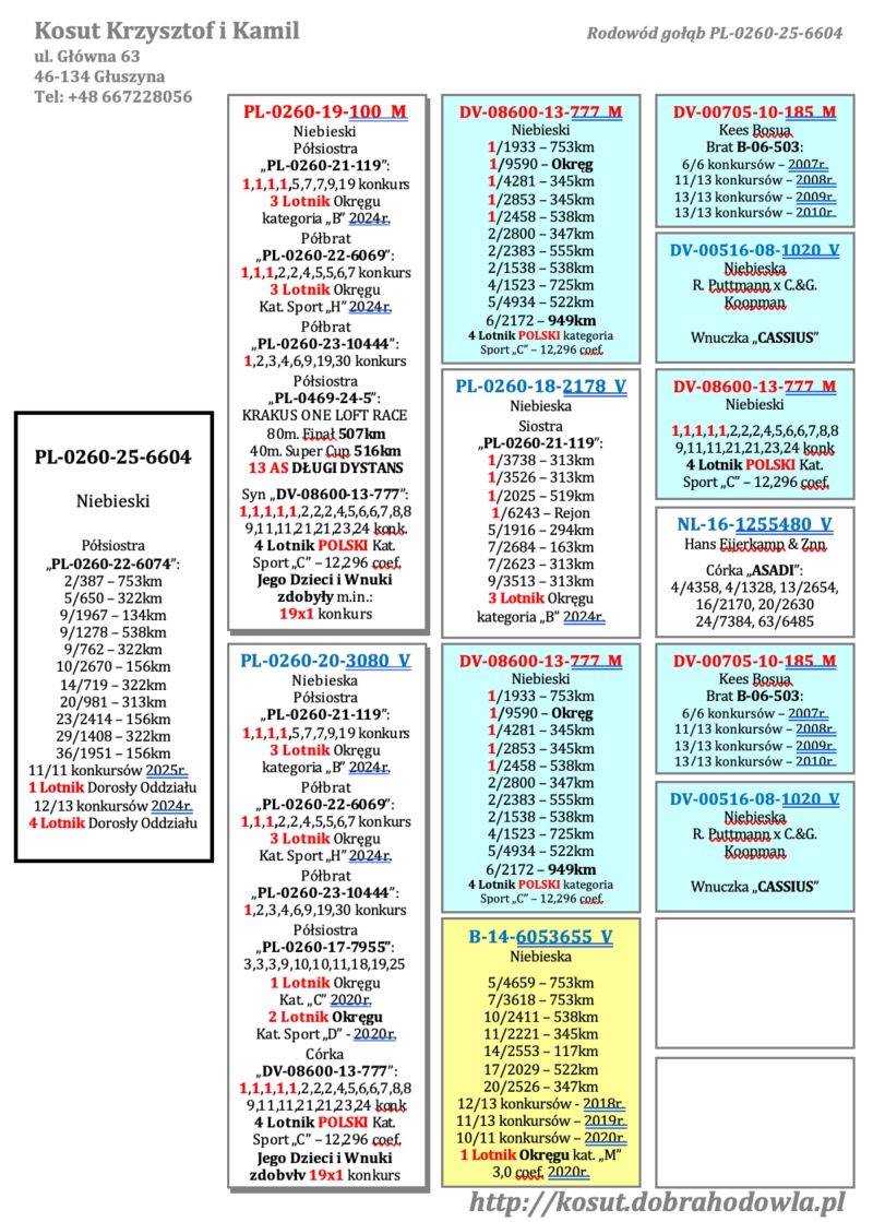 PL-0260-25-6604 – Inbred Syn x Córka „777” – 1,1,1,1,1 konkurs 4 Lotnik Polski oryg. Kosut K. & K. 85x1 konkurs Oddział