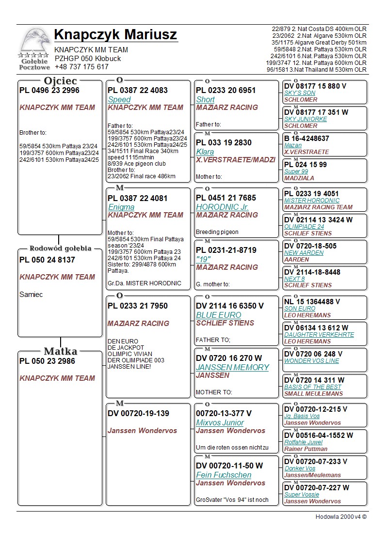 PL-050-24-8137 - KNAPCZYK MM TEAM Pattaya SkyPOWER x Janssen Wondervos z gołębi Mistrza Swiata