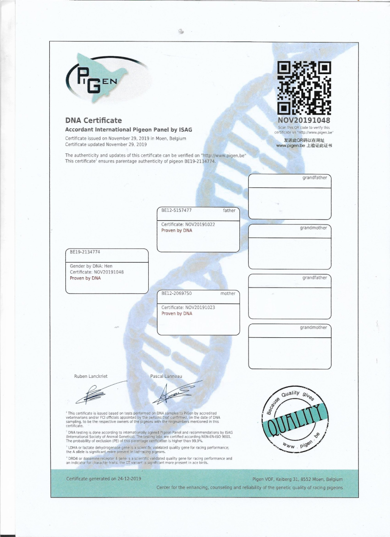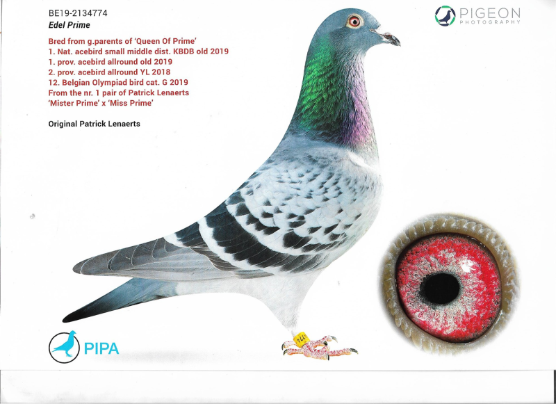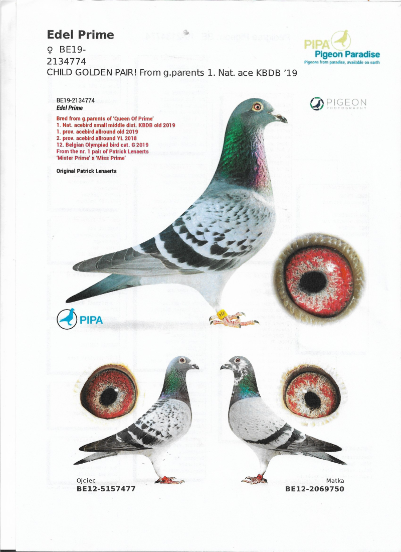 B-19-2134774 ORYG PATRICK LENAERTS "EDEL PRIME"CERTYFIKAT DNA CÓRKA "MISTER PRIME" X "MIS PRIME" PIPA.BE