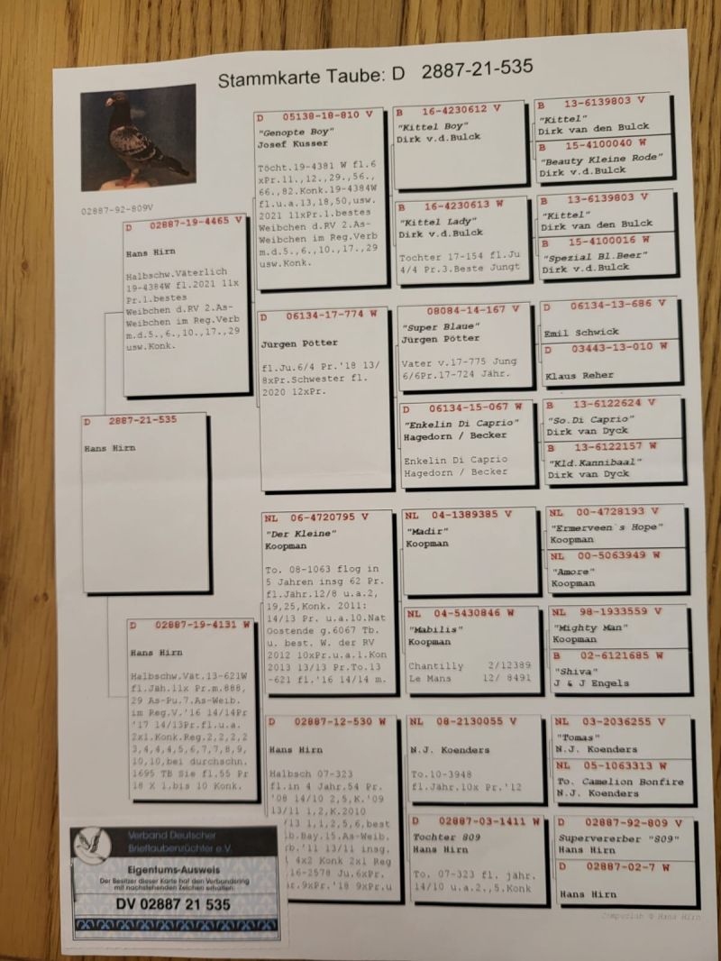 Szczegółowe pochodzenie oferowanego gołębia zostało przedstawione na załączonym rodowodzie