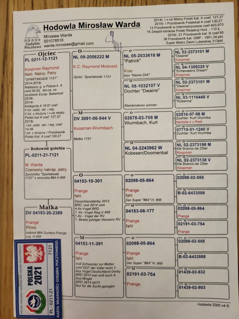 Szczegółowe pochodzenie oferowanego gołębia zostało przedstawione na załączonym rodowodzie