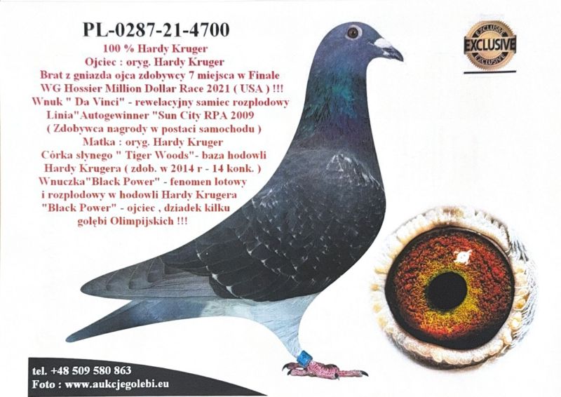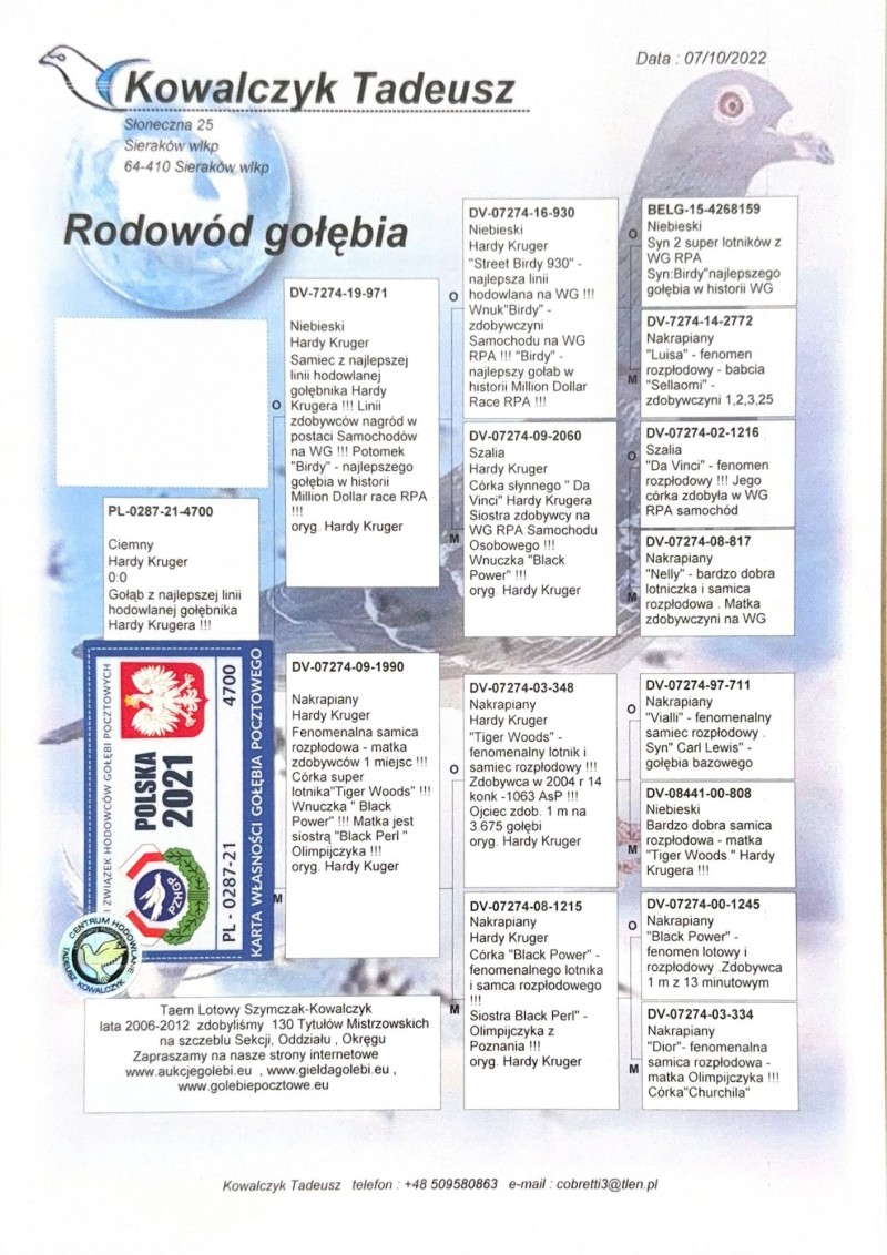 Oryginalny gołąb z hodowli Tadeusza Kowalczyka, gołąb znajduje się w hodowli Arkadiusz Mochtak. Szczegóły pochodzenia w rodowodzie. Więcej informacji pod nr tel.: 690 393 441