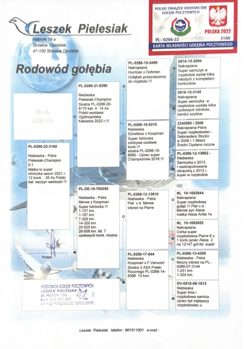 Kontakt: 690 393 441Opis: Oryginalny gołąb z hodowli Leszka Pielesiaka, gołąb znajduje się w hodowli Arkadiusz Mochtak. Szczegóły pochodzenia w rodowodzie. Więcej informacji pod nr tel.: 690 393 441