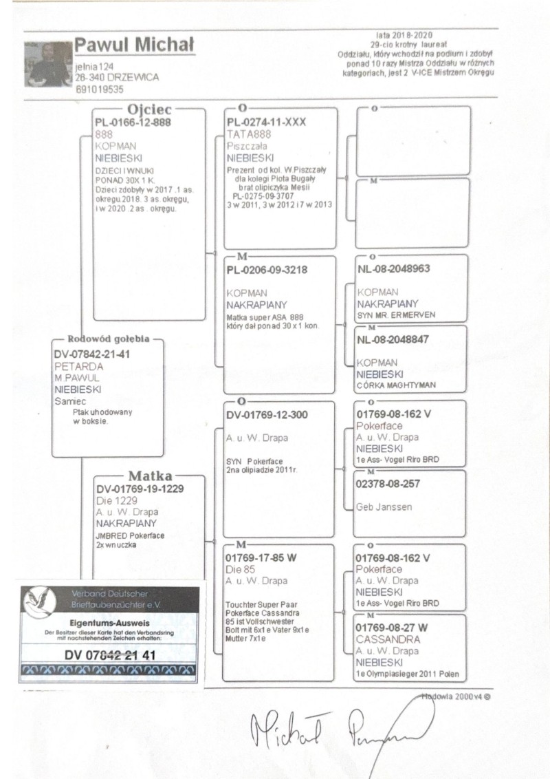 Oryginalny gołąb z hodowli Michał Pawul, gołąb znajduje się w hodowli Arkadiusz Mochtak. Szczegóły pochodzenia w rodowodzie. Więcej informacji pod nr tel.: 690 393 441