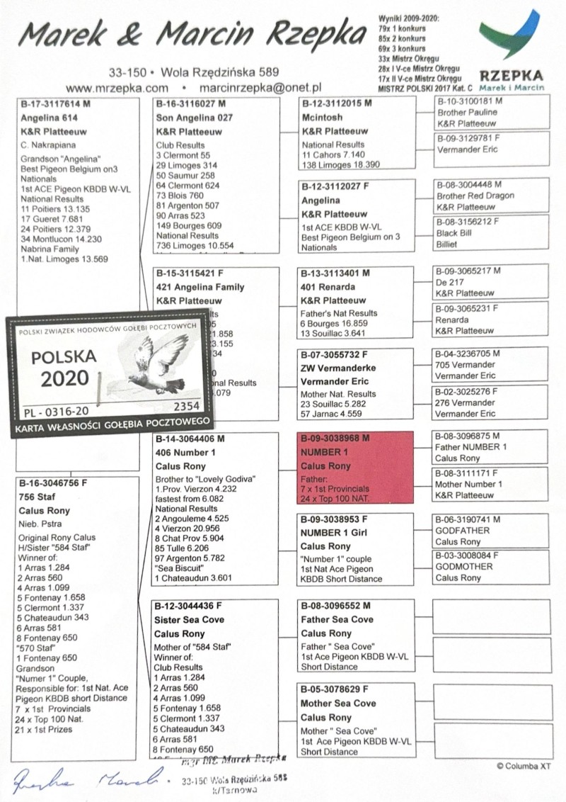 Oryginalny gołąb z hodowli M. & M. Rzepka, gołąb znajduje się w hodowli Arkadiusz Mochtak. Szczegóły pochodzenia w rodowodzie. Więcej informacji pod nr tel.: 690 393 441