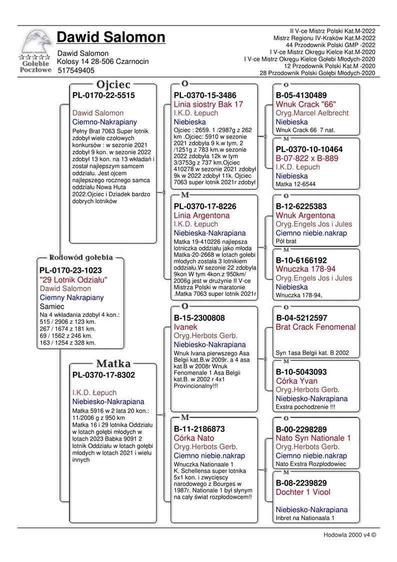 Nieduży, ładnie zbudowany samczyk. Oryginał od Dawida Salomona, bardzo dobrego hodowcy z okręgu Kielce. Samczyk lotowany na młode, zdobył 4/4 ,miejsca na liście konkursowej w rodowodzie. Samczyk zakupiony po lotach młodych, kolega Dawid lotował tylko samiczkami. Linia gołębi Łepuch (Bak 17/Engels/Herbots). Szczegóły pochodzenia w rodowodzie. Kontakt 503 065 248. Wysyłka przez kuriera. Koszt 100zł. Tylko wpłata na konto. Przy zakupie 3 gołębi wysyłka gratis!