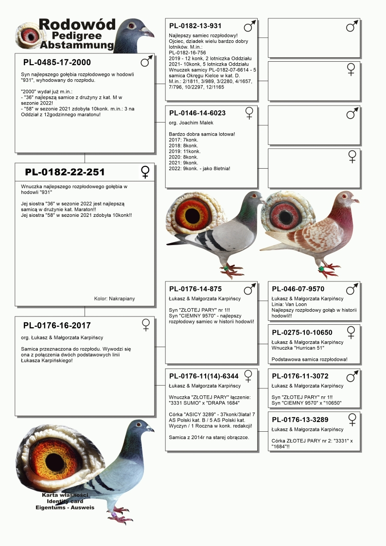 Hodowca określił młodego jako samiczkę. Na wiosnę samiczka okazała się samcem. Przepięknie zbudowany samczyk. Oryginał od Karola Pająka, bardzo dobrego hodowcy z okręgu Kielce. Matką samczyka jest wybitna samica rozpłodowa od Łukasza Karpińskiego. Ojciec to najlepszy rozpłodowy syn zarodowego gołębia 931, samczyk o numerze 2000. Szczegóły pochodzenia w rodowodzie. Kontakt 503 065 248. Wysyłka przez kuriera. Koszt 100zł. Tylko wpłata na konto. Przy zakupie 3 gołębi wysyłka gratis!