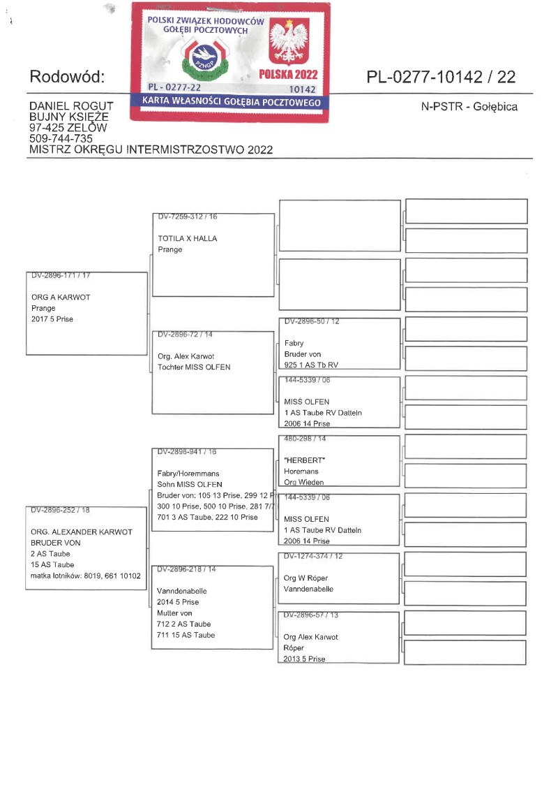 Pięknie zbudowana samiczka od Daniela Roguta, czołowego hodowcy okręgu łódzkiego. Linia gołębi Alexandra Karwota. Szczegóły pochodzenia w rodowodzie. Kontakt 503 065 248. Wysyłka przez kuriera. Koszt 100zł. Tylko wpłata na konto. Przy zakupie 3 gołębi wysyłka gratis!