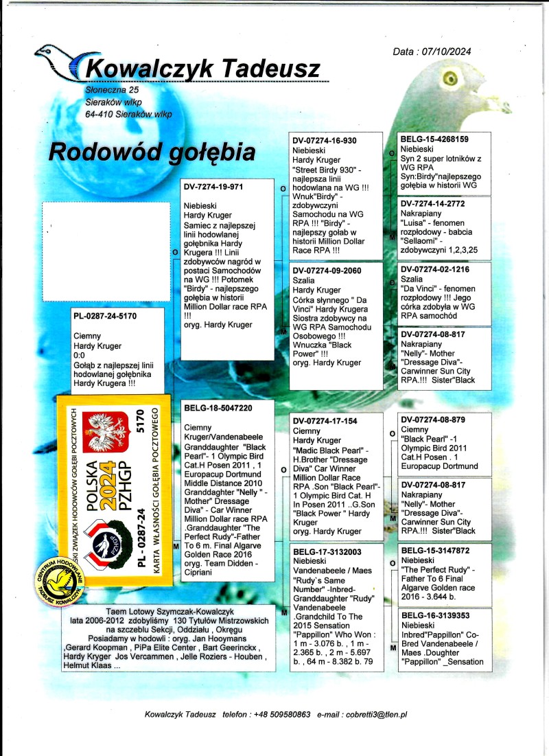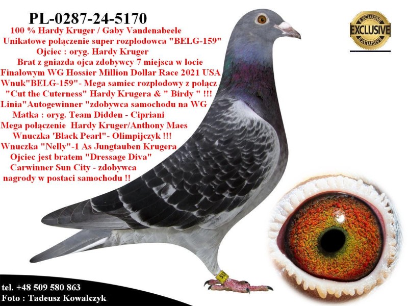 Pięknie zbudowana samiczka oryginał od Tadeusza Kowalczyka. Samiczka wywodzi się z gołębi Hardy Kruger /Gaby Vandenabeele. Gołąb w końcówce pierzenia. Szczegóły pochodzenia w rodowodzie. Kontakt 503 065 248. Wysyłka przez kuriera. Koszt 100zł. Tylko wpłata na konto. Przy zakupie 3 gołębi wysyłka gratis!