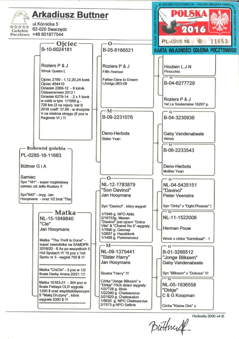 Późny gołąb 2024 roku, w gratisie do zwycięskiej aukcji dołożony będzie jego ojciec - oryg. Buttner G&A PL-0285-16-11683. 11683 to min. ojciec PL-0173-23-17710 - 108 m-ce z finału na As Golden Grecja w 2023 roku. Przesyłka do ustalenia.