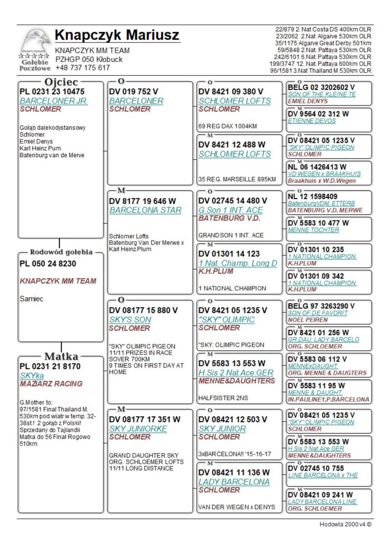 Rodzice gołębia z obu stron to wybiotne gołębie dalekodystansowe z najlepszych hodowli. Inb. SKY Schlomer linia naszych "Patajców" Noel Peiren, Menne, Denyds, Van Der Wegren, Batenburg Van Der Merwe, K.H. PLUM, Etienne Devos. Gołębie z naszej hodowi biorą udział w rywalizacji na całym świecie z największymi potentatami gołębiarskimi! Więcej informacji na tel.
