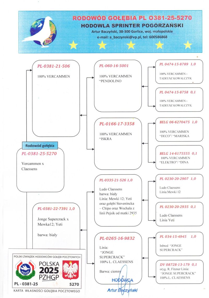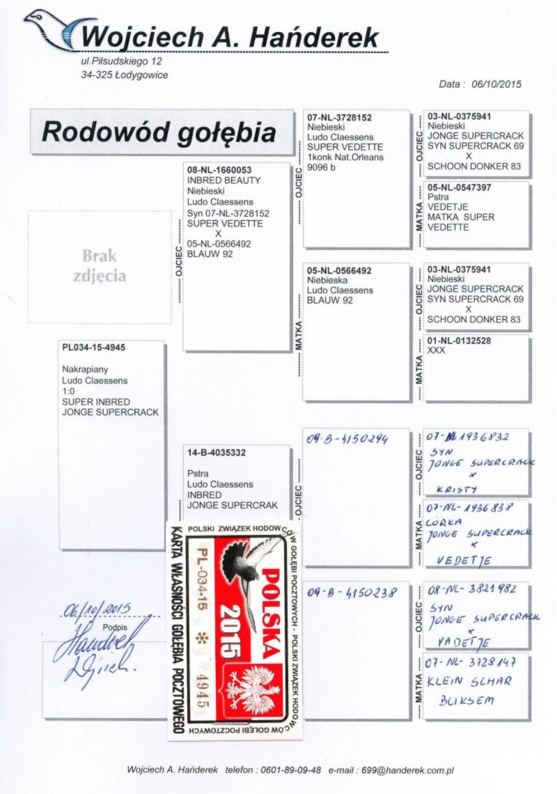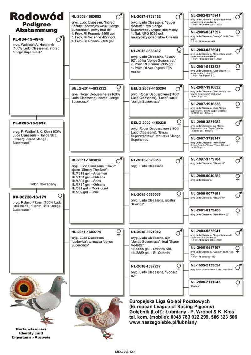 Oryginalny gołąb z hodowli Artura Baczyńskiego. Szczegóły pochodzenia w rodowodzie. Sprzedaż z powodu likwidacji hodowli z przyczyn osobistych. Po zakończonej aukcji odbiór gołębia na miejscu w Gorlicach (woj. małopolskie) lub wysyłka kurierem po wcześniejszym otrzymaniu przelewu na konto. Koszt wysyłki 150 zł.