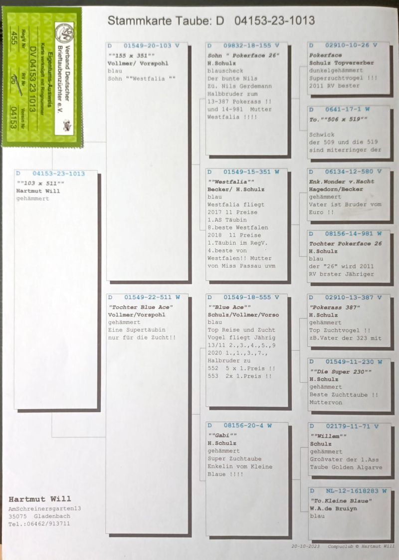 Szczegółowe pochodzenie oferowanego gołębia zostało przedstawione na załączonym zdjęciu rodowodu