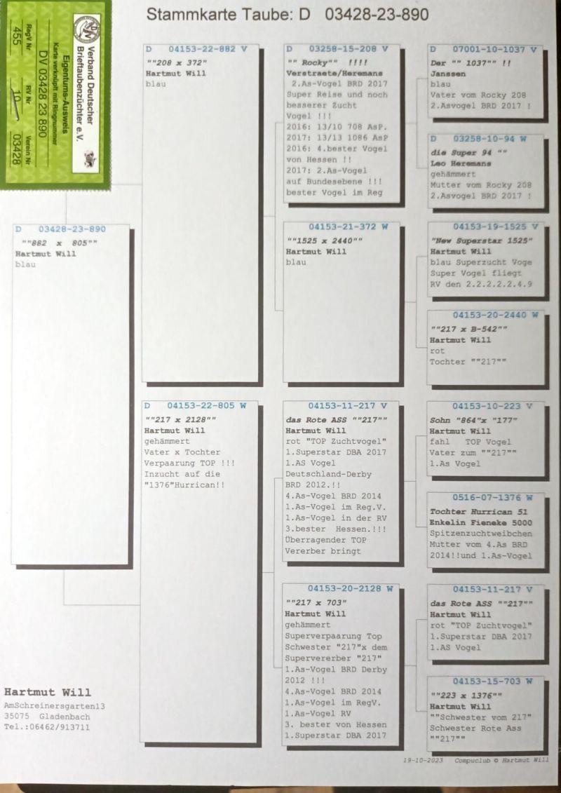 Szczegółowe pochodzenie oferowanego gołębia zostało przedstawione na załączonym zdjęciu rodowodu