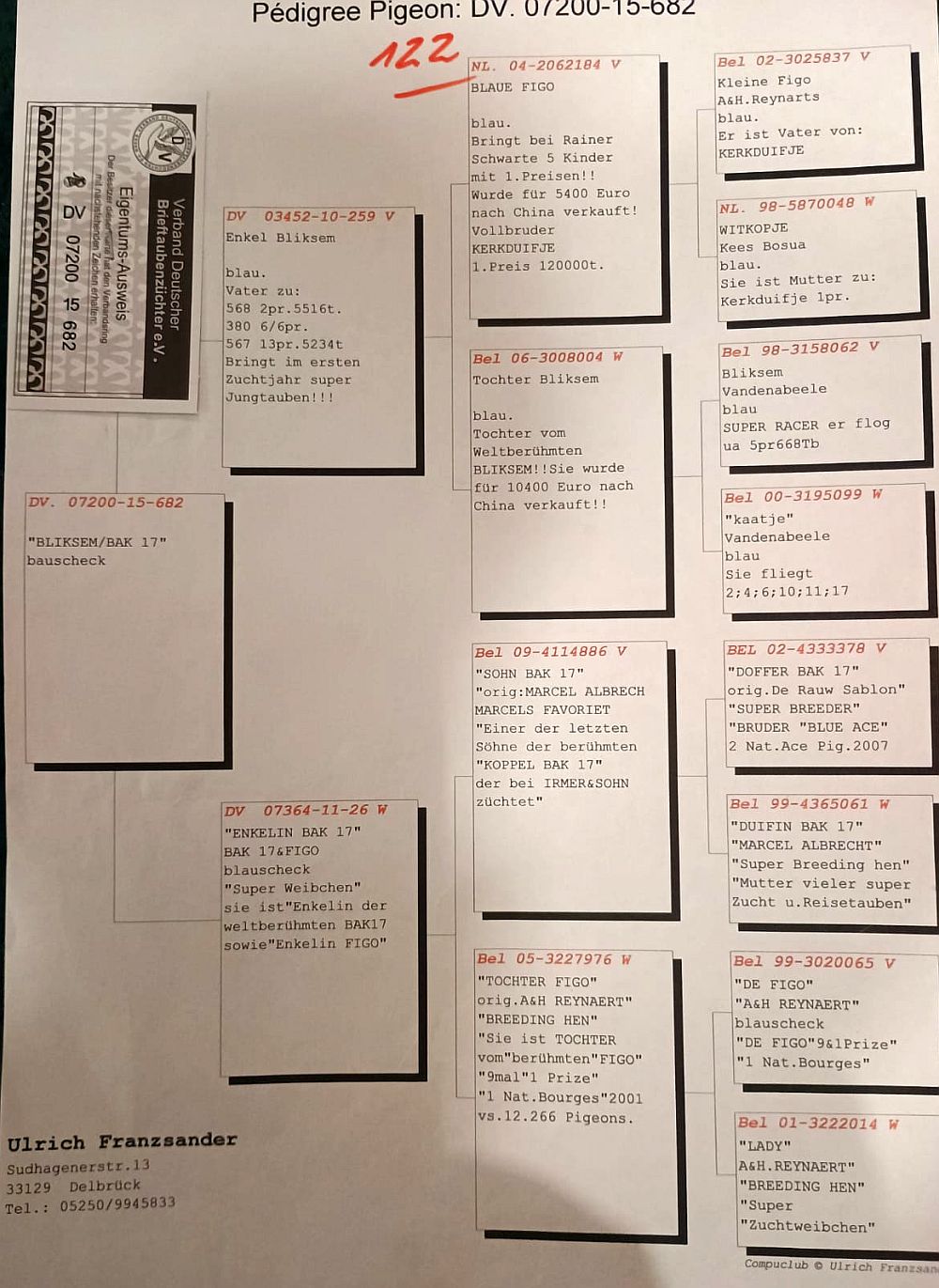 oryg. Ullrich Franzsander (Reynaert/ Aelbrecht), linia "De Figo", "Bak 17", "Zuchtas 26", "Zuchtas 26", wnuk gołębia DV-07364-11-26 zdobył 1 nagrodę na Wystawie Okręgu Wałbrzych w kat. E za sport i standard - PL-DB-19-1039419 kol. Stanisława Hordyńskiego Szczegóły pochodzenia w rodowodzie. Gołąb jest sprzedawany bezpośrednio od hodowcy i znajduje się już w Polsce, można go obejrzeć w miejscowości Zblewo (woj. pomorskie), po wcześniejszym kontakcie telefonicznym. Więcej informacji o gołębiu i transporcie pod nr tel.: 511 607 710.