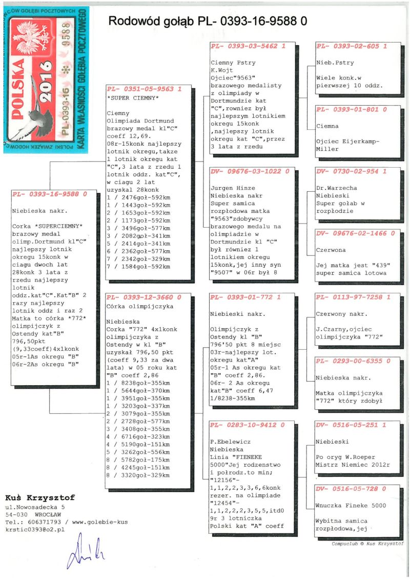 Drobniejszy samczyk, wnuk dwóch wybitnych samców - 9563 - brązowy medalista w kat C z Dortmundu dla Kol K.Kusia oraz 461 - jednego z najlepszych rozpłodowców w Polsce ! "461" najważniejsze referencje z 2024 roku: 1 As Rejonu z 8 lotów rejonowych - prawnuczka 461 u Kol Adama Gasperowicza, prawnuk "461" wygrał finał na WG Podhale wygrywając 50 000 dla Kolegi Bogdana Bieli !- liczba jedynek jego wnuków , prawnuków i oczywiście dzieci będzie około stu a kilkadziesiąt gołębi z 461 zajmowało top 10 w kat As w różnych kategoriach w różnych okręgach w Polsce- tylko w 2022 roku w 9 różnych oddziałach przeważnie prawnuki zdobywały 1 lokatę w oddz !!! Jego wnuczka została też na olimpiadzie w tym roku 4 gołębiem świata w kat H dla Kol Łukasza Reguły. !! Na screenie przykład jak potrafią siadać gołębie w oddz z linii 461 ... 3-prawnuk,4 -wnuk , 5-wnuk , 6 - roczna wnuczka - kat A 9 z groszem ma , 7 wnuk , 11 - wnuk oraz 15 - wnuk 461. oraz kolejny lot z 2020 roku : 1,2,3,5,7,8 wnuk oraz 15 prawnuk ? do tego roczna samiczka Kolegów Piotra I Marcina Żureckich z Kępna została 6 asem Polski w kat G ...tak leciała... 2 na 5200 g ze 174 km 8 na 4573 z 219 km 8 na 3583 g z 324 km 8 na 1764 g z 324 g 21 na 4535 g z 549 km - rej - coeff jak widać na zdjęciu 13,54 miała też szósty super lot była 25 na 4984 g coeff 5,02 1 goląb z Extra finału na WG Giewont 2022 dla Teamu Chudy-Molek to też linia "461" ojciec to syn mojej super wdowy 2161-12 ,, Dwie Prawnuczki .... u Kol Kazimierza Goździejewskiego ( jedna w kat M w 2023 roku miała coeff 4,84 ( 1 as okręgu Wałbrzych a druga w 2024 roku 2,58 - 2 x 1 na oddział (2 as Polski kat M w/g miesięcznika "Hodowca") - w kat "I" - coeff 9 z haczykiem), "461" to też pradziadek PL-0122-22-2219 - w 2 sezony na 21 wkładań 20 konkursów - kat A coeff 9,08 a z dwóch lat do wystaw kat A-74,86 , kat B-65,94 a kat D-72,20 W 2023 roku zdobył 1 konk na ok 4100 gołębi z miejsc Sulechów a w 2024 roku 2 x 2 konk w oddz !!! oraz pradziadek PL-0122-22-5510 w kat A w 2024 roku uzyskał coeff. 4,75 Zdobył też 1 konk na oddz z miejsc. Brzeg Dolny na 4322 gołębie !! Został też 4 Asem Polski kat krótki dystans 2024 z coeff 17 z groszem z 5 lotów do kat A właśnie dla Kolegi Jacka Orszulika !!! oraz wiele,wiele innych.....od 2017 roku 30x mistrzostwo oddz w różnych kategoriach w tym 2019-2021 3 x z rzędu supermistrzostwo oddziału Poznań, więcej info 601 877 544
