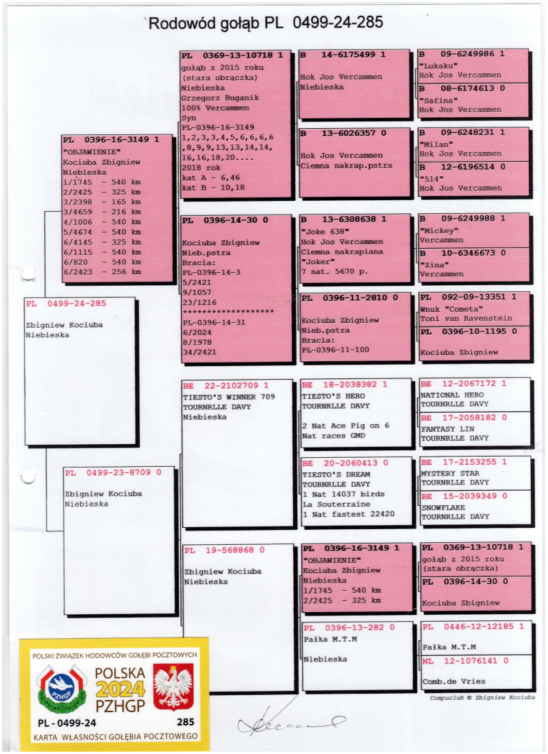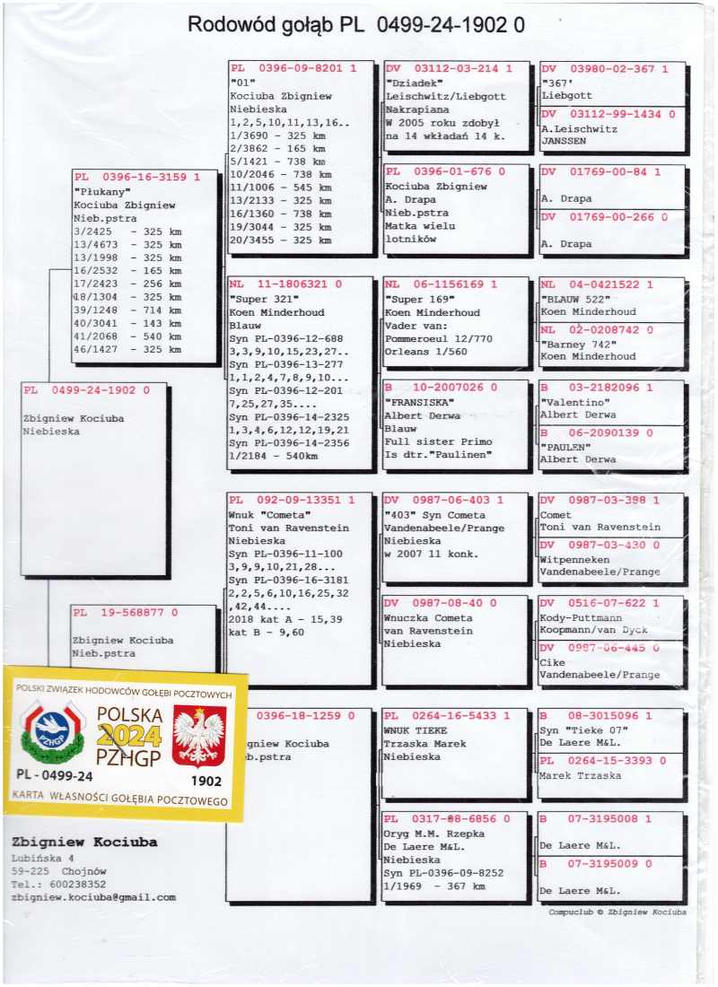 Oryginalny gołąb z hodowli R. i K. Szaranek. Oferowany gołąb wywodzi się z 2 Oryginalnych gołębi Zbigniewa Kociuby. Jest on Wnukiem Słynego "Objawienia" oraz Prawnukiem "Super 321" Gołąbek zostaje wystawiony z powodu Nadwyżki Samców. Jest to gołąbek z Przełomu Lipca/Sierpnia. Po zakończonej aukcji wpłata na konto, Możliwość dowozu prywatnym kurierem koszt około 180zł. Więcej informacji pod nr.tel.: 663490677