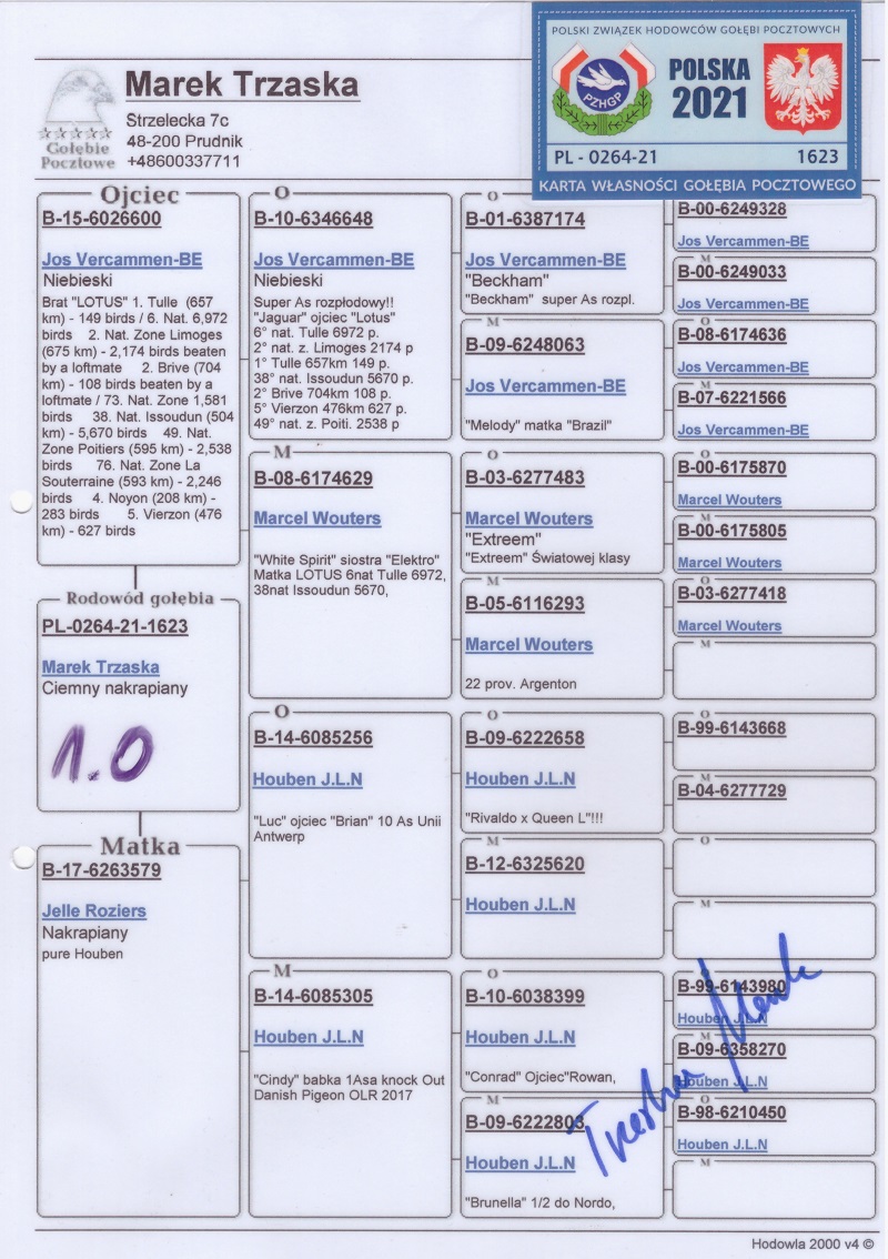 Oryginalny gołąb z hodowli Marka Trzaski. Samiec o kapitalnej budowie, jego ojciec to oryginalny gołąb od Jos Vercammen a matka od Jelle Roziers - 100% Houben