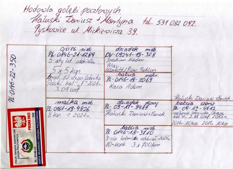 Oryginalny gołąb z hodowli D. i M. Kałuski. Lotowany w 2023 roku 5 Lotnik Okręgu kat.G coeff. 36,52 1,9,10,13,21 k. Szczegóły pochodzenia w rodowodzie. Więcej informacji pod nr tel.: 665-762-313 *Odbiór osobisty woj. lubelskie lub wysyłka kurierem kupujący pokrywa koszt wysyłki