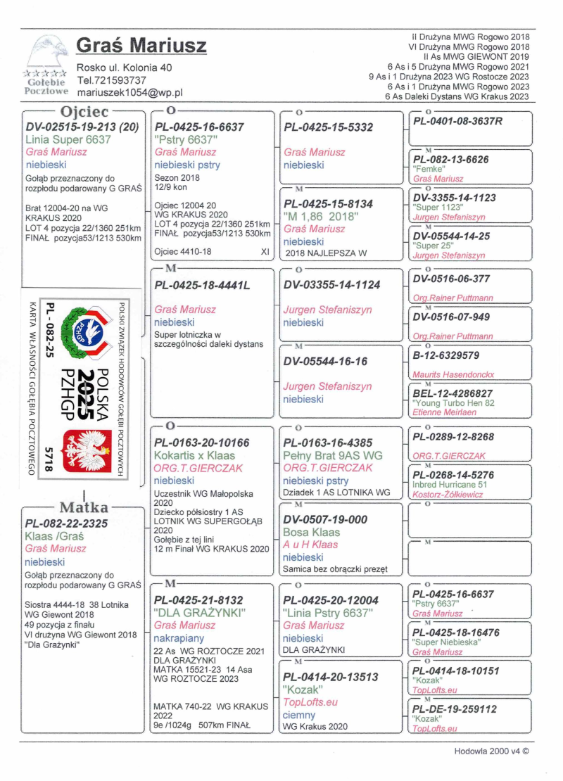 Opis: Gołąbek po całym bardzo wymagającym programie na WG ROZTOCZE 2025 loty z wiatrem pod wiatr i boczny w każdych warunkach sobie poradziły. 7 Lotów Konkursowych 1515 kkm zdobywając 144 miejsce z Finału 505km. więcej info.w rodowodzie i na stronie Benzing Live. oneloftrace.live/lofts/260?season=2458&tab=flights zapraszamy na sezon 2026. Dostawa wylicytowanego gołębia na terenie Polski 160zł.