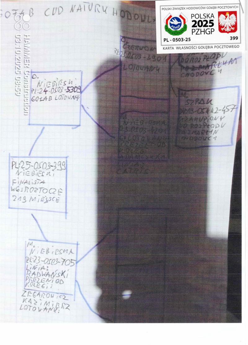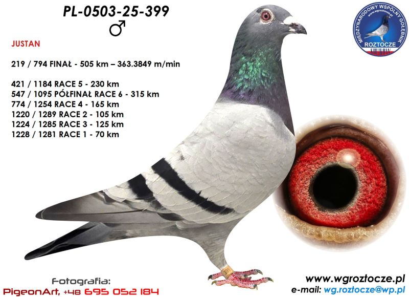 Opis: Gołąbek po całym bardzo wymagającym programie na WG ROZTOCZE 2025 loty z wiatrem pod wiatr i boczny w każdych warunkach sobie poradziły. 8 Lotów Konkursowych 2015 kkm zdobywając 219 miejsce z Finału 505km. więcej info.w rodowodzie i na stronie Benzing Live. oneloftrace.live/lofts/260?season=2458&tab=flights zapraszamy na sezon 2026. Dostawa wylicytowanego gołębia na terenie Polski 160zł.