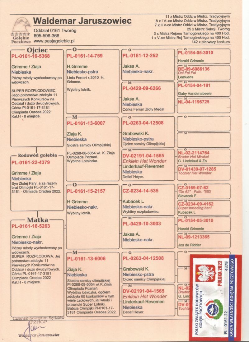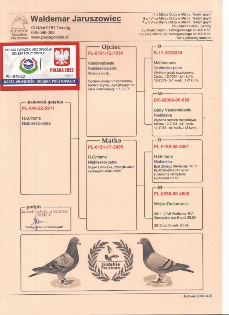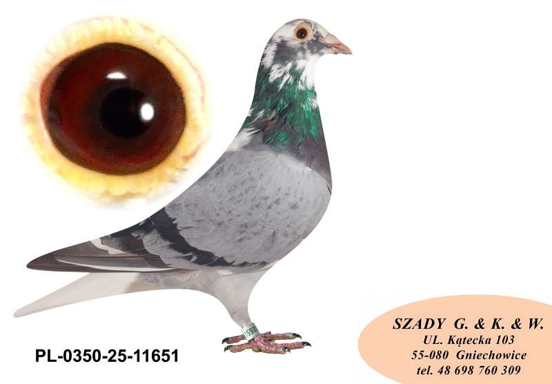 Witam. Gołąb pochodzi z hodowli Szady GKW. Szczegóły pochodzenia w rodowodzie. Zaszczepiony 16.09.2025 szczepionką RP VACC. Płatność za gołębia - przelew na konto. Transport będę organizował po zakończeniu wszystkich aukcji na początku grudnia. Koszt transportu indywidualnie w zależności od odległości i ilości gołębi. Więcej informacji pod nr tel. : 698 760 309.