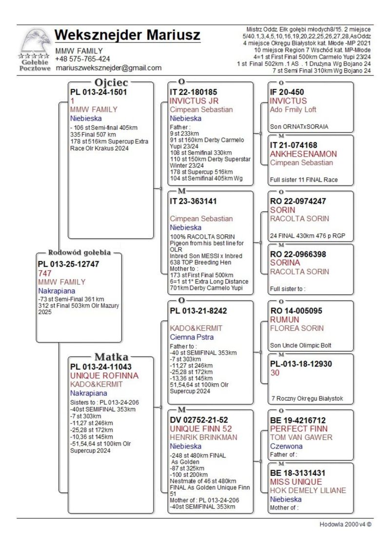 Szczegóły pochodzenia w rodowodzie. Pełne wyniki gołębia w sezonie lotowym na stronie: