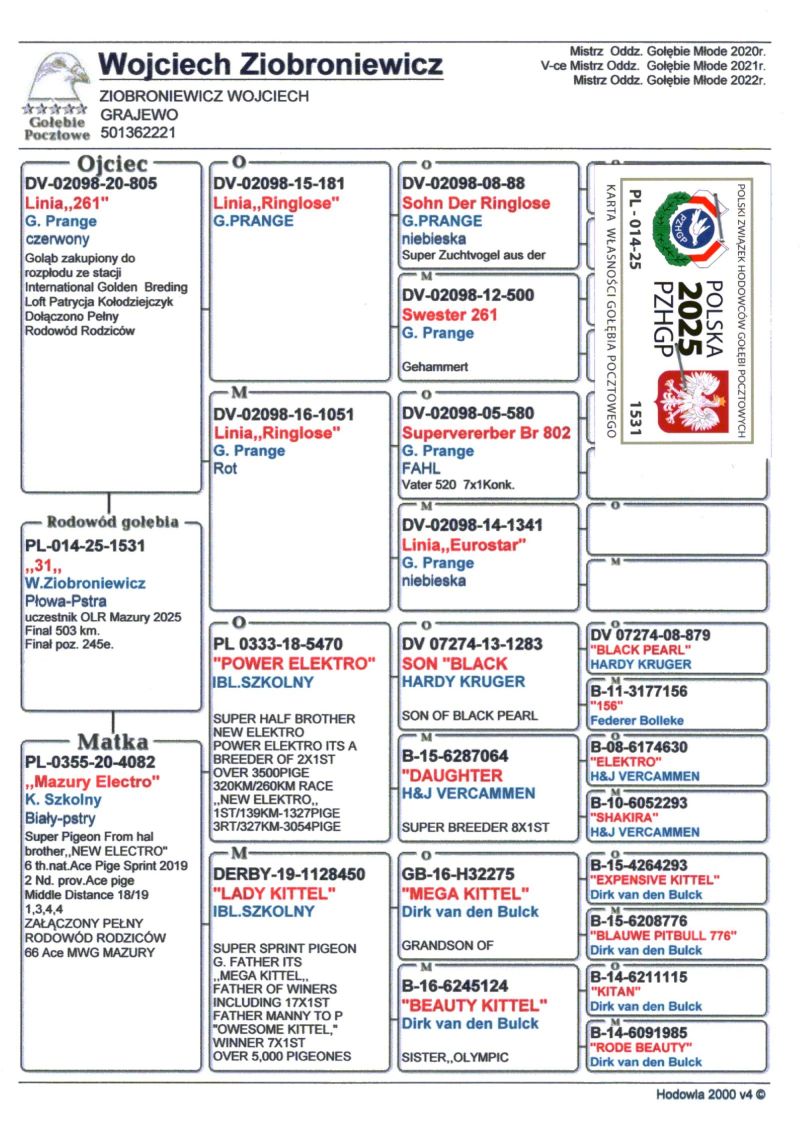 Opis: Gołąb PL-014-25-1531 - uczestnik 8 edycji OLR Mazury 2025. Ukończył cały program tegorocznej edycji. 245 miejsce z finału, 227 AS OLR Mazury. Szczegóły pochodzenia w rodowodzie. Pełne wyniki gołębia w sezonie lotowym na stronie: oneloftrace.live/lofts/148/teams/4420632/pigeons/34498242 Kontakt w sprawie transportu - Mariusz tel. 575-765-424. Konto do wpłat za gołębie z aukcji: SANTANDER BANK POLSKA S.A. 06 1090 2792 0000 0001 5996 3839 Zapraszamy do licytacji.