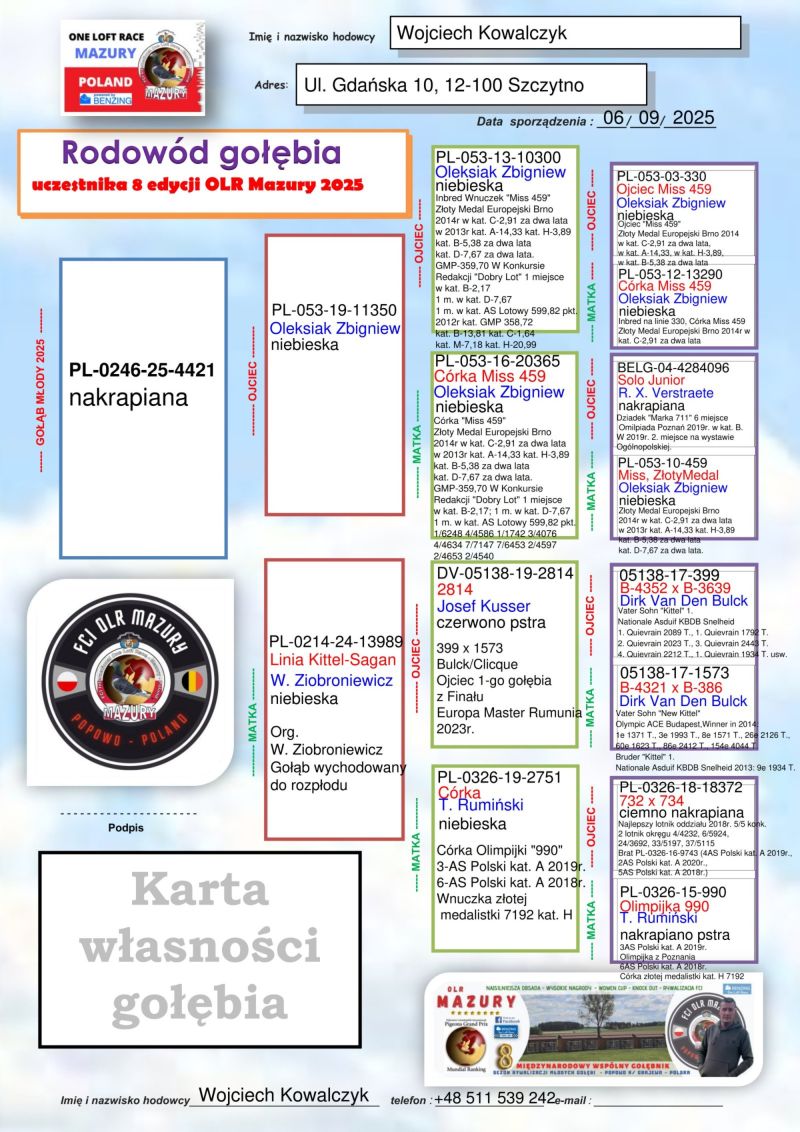 Opis: Gołąb PL-0246-25-4421 - uczestnik 8 edycji OLR Mazury 2025. Ukończył cały program tegorocznej edycji. 309 miejsce z finału, 194 AS OLR Mazury. Szczegóły pochodzenia w rodowodzie. Pełne wyniki gołębia w sezonie lotowym na stronie: oneloftrace.live/lofts/148/teams/4351689/pigeons/34056656 Kontakt w sprawie transportu - Mariusz tel. 575-765-424. Konto do wpłat za gołębie z aukcji: SANTANDER BANK POLSKA S.A. 06 1090 2792 0000 0001 5996 3839 Zapraszamy do licytacji.