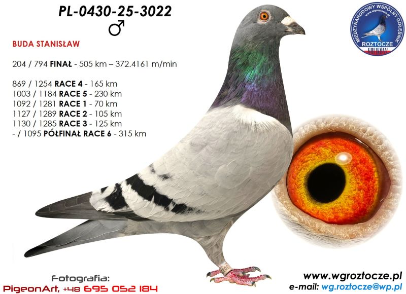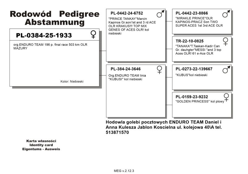 Szczegóły pochodzenia w rodowodzie. Pełne wyniki gołębia w sezonie lotowym na stronie: