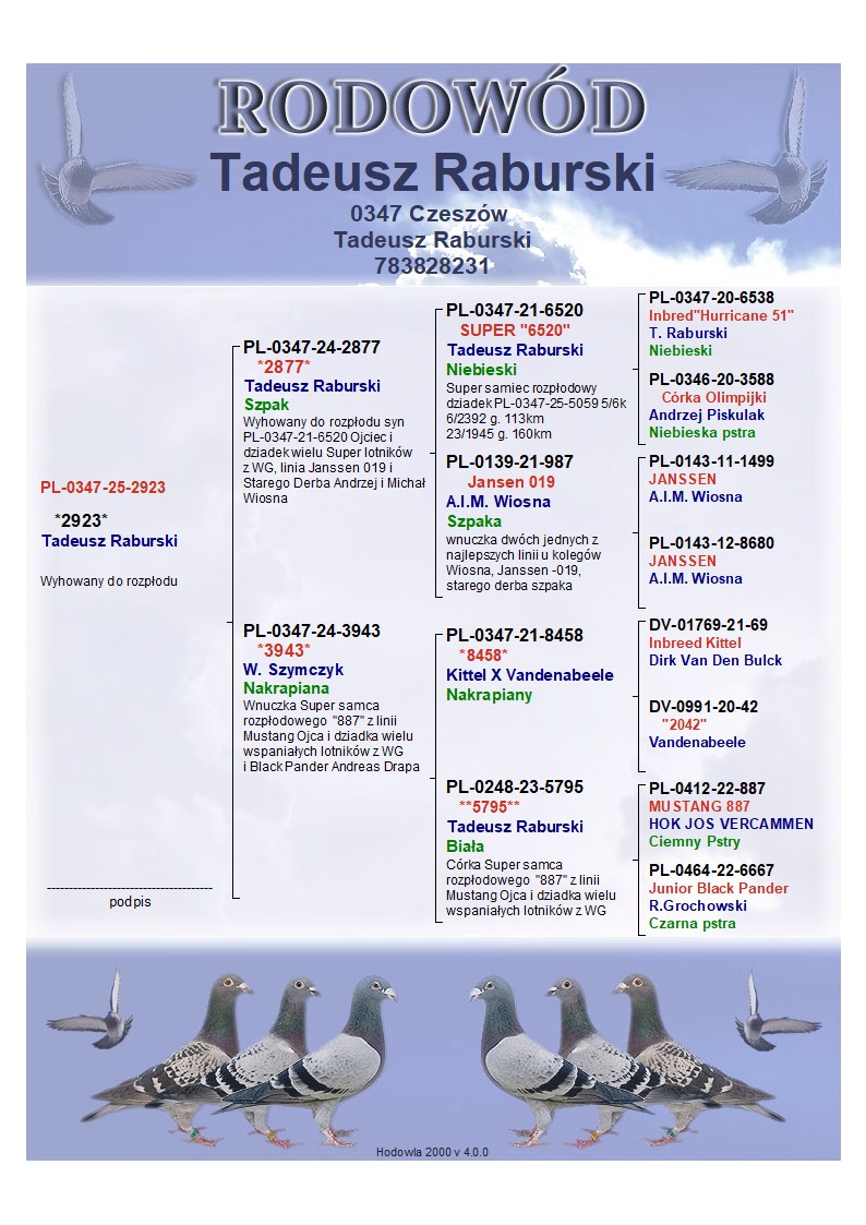 Kontakt: 783 828 231Opis: Hodowla skupiona w lotach gołębi na wspólnych gołębnikach z wieloma sukcesami. Zaprasza Państwa do licytacji wartościowego materiału do dalszej hodowli. Proponowany gołąb to linia moich dwóch bazowych par rozpłodowych, wielu kuzynów osiąga sukcesy na wspólnych gołębnikach. Więcej informacji w rodowodzie oraz pod nr. tel. WYSYŁKA 100ZŁ