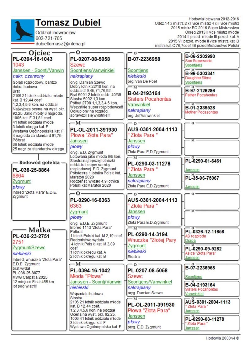 Córka "Złotej Pary" E.D.E. Zygmunt w połączeniu z super samcem od Damiana Szewca z linii olimpijki kat. C „Pocahontas” Jefa Vanwilkel dały mi wybitne lotniki i gołębie rozpłodowe. Ptaki te zdobyły u mnie wiele czołowych nagród w lotach w różnych kategoriach, oraz na wystawach. Samiczka z „moich Zygmuntów” jest babką 1 lotnika oddziału 2024 i 5 lotnika oddziału 2023 u rodziny Zygmunt. W 2025 samczyk z tych gołębi wydał 12 gołębia z finału na WG Carpati.