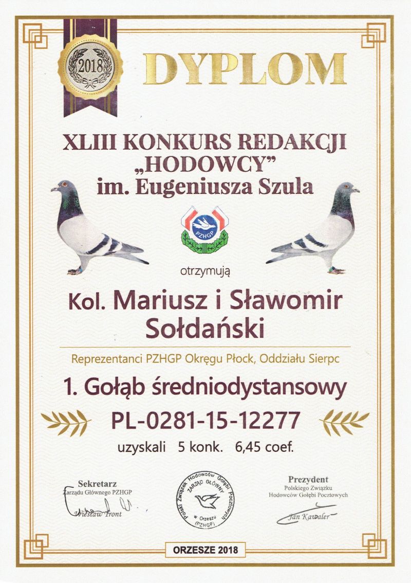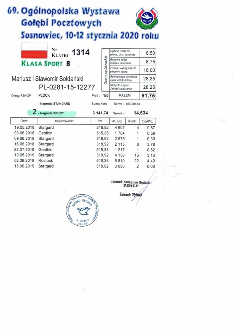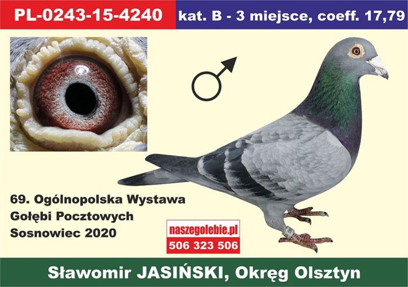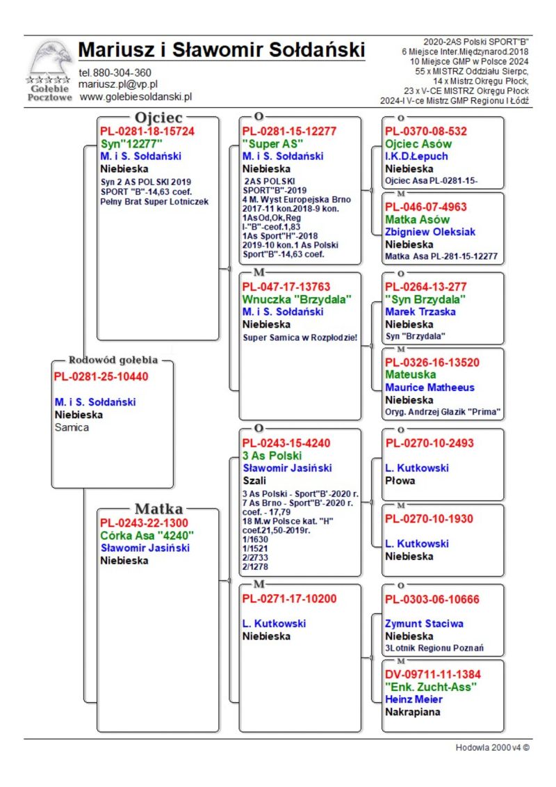 Oryginalna samica z hodowli Mariusz i Sławomir Sołdański . Gołąbek pochodzi z linii 4240 Burego Sławomira Jasińskiego x nasz As "12277". Więcej informacji o gołębiu pod nr tel. i poniższych materiałach. Nasze wyniki w Mistrzostwie Polski 2018: 6 Miejsce w Intermistrzostwie Międzynarodowym - coeff. 151,73; 23 Miejsce GMP - 1874,73; 29 Miejsce Kat.B - coeff. 86,45. 1 Miejsce Gołąb Średni dystans-Konkurs Redakcji "Hodowca", 1 Miejsce Kat."B"-Konkurs Redakcji "Dobry Lot", 3 Miejsce Kat."D"-Konkurs Redakcji "Dobry Lot", 2 Miejsce "Mistrzostwo Asów Allround"-Konkurs Redakcji "Dobry Lot", 1 Miejsce Kat."B"-Konkurs Redakcji "Poradnik Hodowcy". 2019-Oddział Sierpc: Typowane Mistrz, Open I-vce Mistrz, Open 50 II-V-ce Mistrz, 1 i 3 Lotnik Roczny, Kat. A II V-ce Mistrz, Kat. B II V-ce Mistrz, Kat. D II V-ce Mistrz, Kat. GMP I v-Ce Mistrz, Kat. Inter. I V-ce Mistrz, Super. I V-ce Mistrz. Okręg Płock: II V-ce Mistrz Supermistrzostwo, I V-ce Mistrz GMP, II Lotnik. kat. B. 10 Gołębi w Reprezentacji Okręgu na Wystawę Ogółnopolską 2020. 2 AS POLSKI SPORT „B”-14,62 coef. 2020-Oddział Sierpc: Typowane Mistrz, Open I-vce Mistrz, Open 50 I-V-ce Mistrz, 1 Lotniczka Roczna, Kat. C Mistrz, Kat. M II V-ce Mistrz, Kat. D II V-ce Mistrz, Kat. GMP Mistrz, Kat. Inter. II V-ce Mistrz, Mistrz. Okręg Płock: Kat. GMP Mistrz , Kat.Roczne Mistrz, Kat. C-I Vce Mistrz , Kat. M - I Vce Mistrz Mistrz.Regionu I Łódż- V-ce Mistrz „Roczne” 2021- Supermistrz Oddziału Sierpc Mistrz Okręgu Płock Kat." Maraton" Supermistrz Okręgu Płock,2022 6 gołębi w reprezentacji Okręgu Płock na Wystawę Ogólnopolską.2022- II Supermistrz Oddziału Sierpc, 8 x V-ce Mistrz Oddziału. 1 AS WG Kaszuby 2022, 2 drużyna WG Kosakowo 2022, 4 AS WG Kosakowo. 6 AS WG Roztocze 2022. 6 gołębi w reprezentacji Okręgu Płock na Wystawę Ogólnopolską 2023. 2022-1 Samica w Polsce PL-0281-17-3077 w Kat. "Supermaraton"- Konkurs Redakcji"Hodowca". 2024 - 10 Miejsce w Polsce w kat. GMP 1 Miejsce Finał Wg Zatoka Puck 3 i 6 As Zatoka Puck