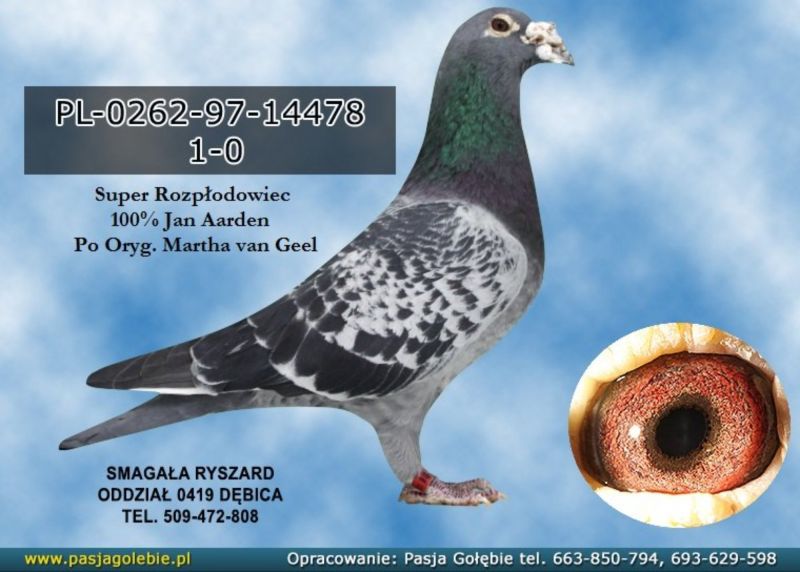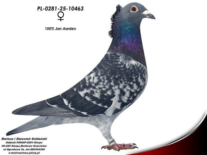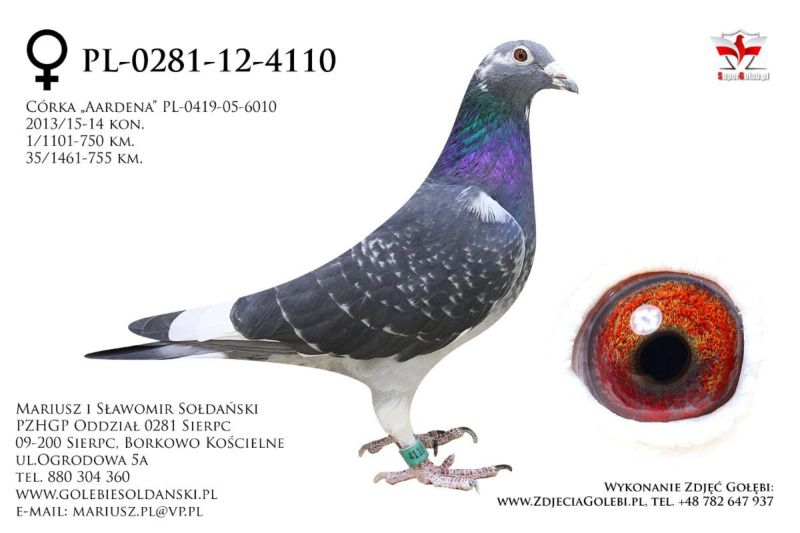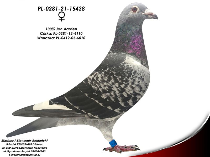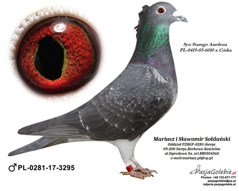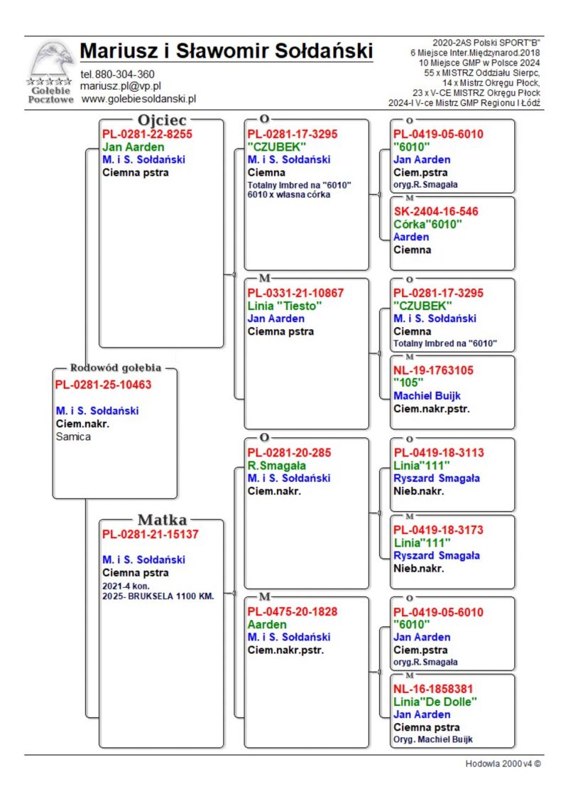 Oryginalna samica z hodowli M. i S. Sołdanski, 100% Jan Aarden Linia naszego super rozpłodowca PL-0419-05-6010 Ryszarda Smagały super linia na długie dystanse. Więcej informacji o gołębiu pod nr tel. i poniższych materiałach. Nasze wyniki w Mistrzostwie Polski 2018: 6 Miejsce w Intermistrzostwie Międzynarodowym - coeff. 151,73; 23 Miejsce GMP - 1874,73; 29 Miejsce Kat.B - coeff. 86,45. 1 Miejsce Gołąb Średni dystans-Konkurs Redakcji "Hodowca", 1 Miejsce Kat."B"-Konkurs Redakcji "Dobry Lot", 3 Miejsce Kat."D"-Konkurs Redakcji "Dobry Lot", 2 Miejsce "Mistrzostwo Asów Allround"-Konkurs Redakcji "Dobry Lot", 1 Miejsce Kat."B"-Konkurs Redakcji "Poradnik Hodowcy". 2019-Oddział Sierpc: Typowane Mistrz, Open I-vce Mistrz, Open 50 II-V-ce Mistrz, 1 i 3 Lotnik Roczny, Kat. A II V-ce Mistrz, Kat. B II V-ce Mistrz, Kat. D II V-ce Mistrz, Kat. GMP I v-Ce Mistrz, Kat. Inter. I V-ce Mistrz, Super. I V-ce Mistrz. Okręg Płock: II V-ce Mistrz Supermistrzostwo, I V-ce Mistrz GMP, II Lotnik. kat. B. 10 Gołębi w Reprezentacji Okręgu na Wystawę Ogółnopolską 2020. 2 AS POLSKI SPORT „B”-14,62 coef. 2020-Oddział Sierpc: Typowane Mistrz, Open I-vce Mistrz, Open 50 I-V-ce Mistrz, 1 Lotniczka Roczna, Kat. C Mistrz, Kat. M II V-ce Mistrz, Kat. D II V-ce Mistrz, Kat. GMP Mistrz, Kat. Inter. II V-ce Mistrz, Mistrz. Okręg Płock: Kat. GMP Mistrz , Kat.Roczne Mistrz, Kat. C-I Vce Mistrz , Kat. M - I Vce Mistrz Mistrz.Regionu I Łódż- V-ce Mistrz „Roczne” 2021- Supermistrz Oddziału Sierpc Mistrz Okręgu Płock Kat." Maraton" Supermistrz Okręgu Płock,2022 6 gołębi w reprezentacji Okręgu Płock na Wystawę Ogólnopolską.2022- II Supermistrz Oddziału Sierpc, 8 x V-ce Mistrz Oddziału. 1 AS WG Kaszuby 2022, 2 drużyna WG Kosakowo 2022, 4 AS WG Kosakowo. 6 AS WG Roztocze 2022. 6 gołębi w reprezentacji Okręgu Płock na Wystawę Ogólnopolską 2023. 2022-1 Samica w Polsce PL-0281-17-3077 w Kat. "Supermaraton"- Konkurs Redakcji"Hodowca". 2024 - 10 Miejsce w Polscew kat. GMP