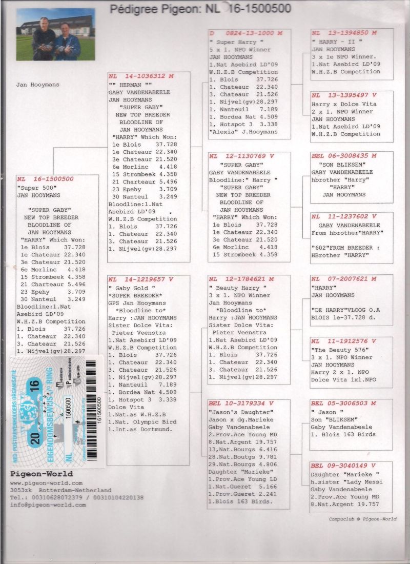 NL-16-1500500 Oryg. Pigeon World 100% Jan Hooymans Inbred na "Harry"