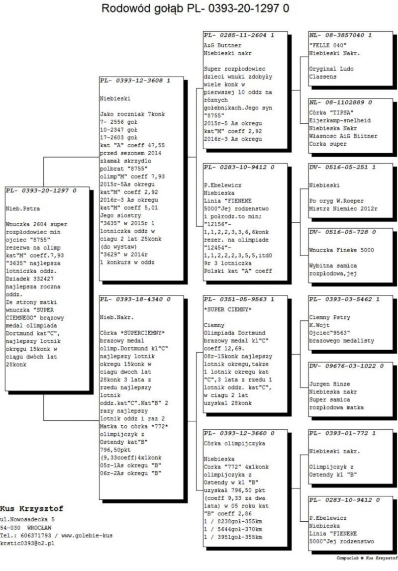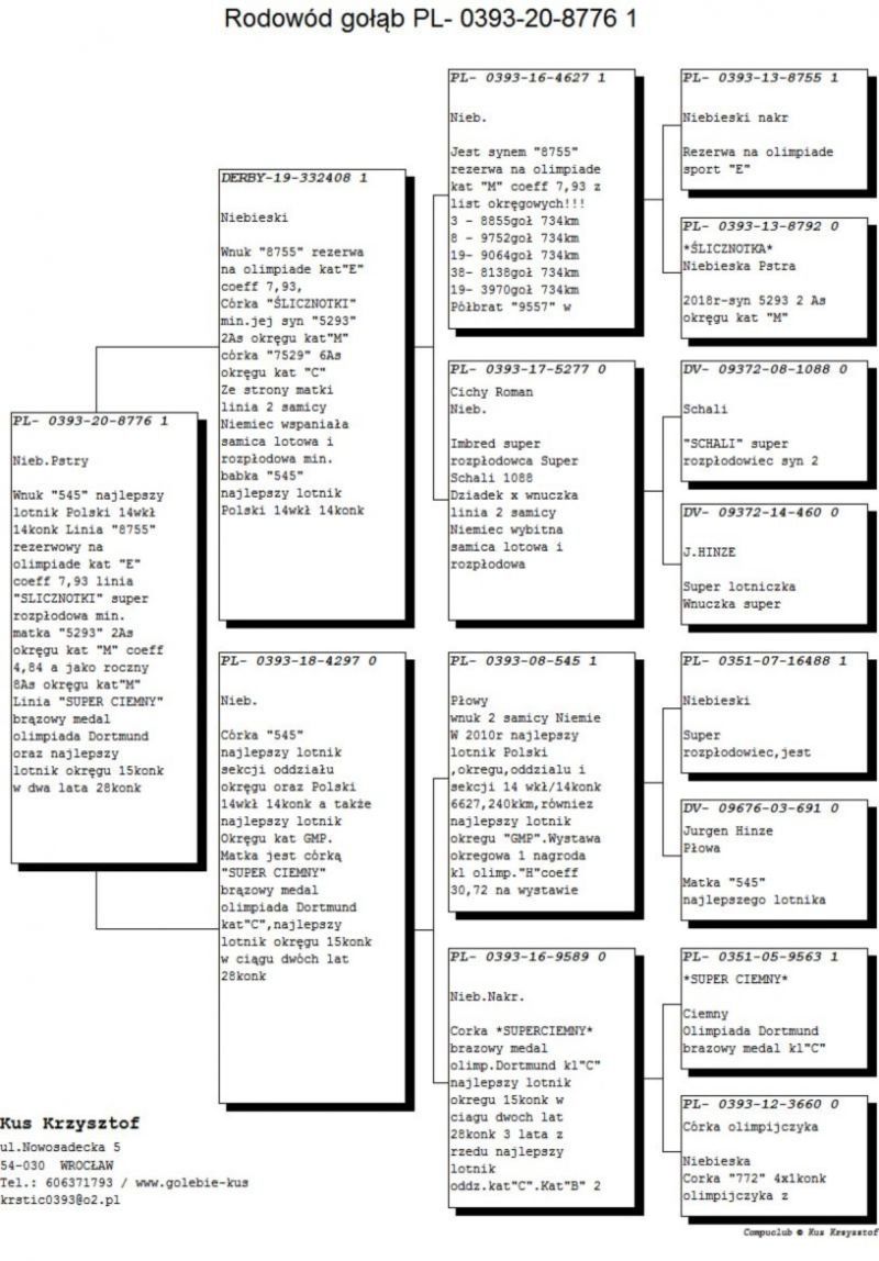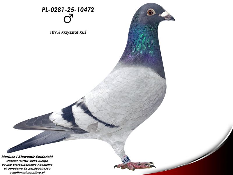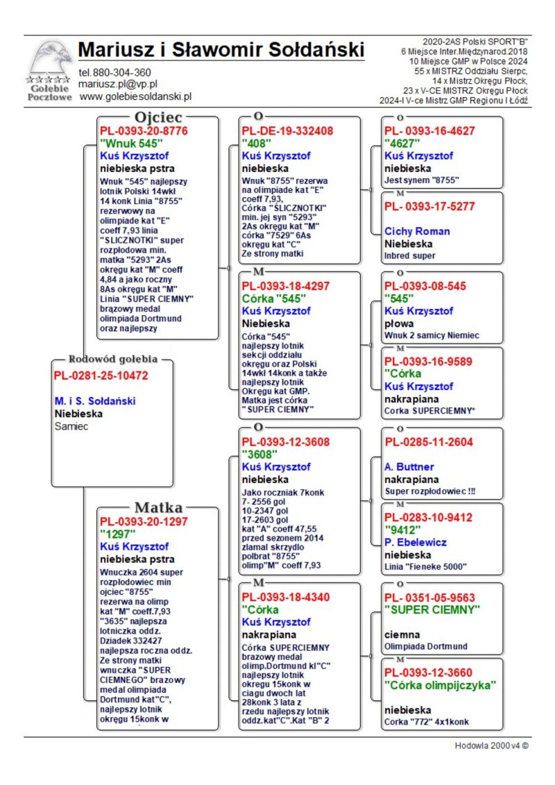 Oryginalny samiec z hodowli M. i S. Sołdańscy 100% Krzysztof Kuś.Więcej informacji o gołębiu pod nr tel. i poniższych materiałach. Nasze wyniki w Mistrzostwie Polski 2018: 6 Miejsce w Intermistrzostwie Międzynarodowym - coeff. 151,73; 23 Miejsce GMP - 1874,73; 29 Miejsce Kat.B - coeff. 86,45. 1 Miejsce Gołąb Średni dystans-Konkurs Redakcji "Hodowca", 1 Miejsce Kat."B"-Konkurs Redakcji "Dobry Lot", 3 Miejsce Kat."D"-Konkurs Redakcji "Dobry Lot", 2 Miejsce "Mistrzostwo Asów Allround"-Konkurs Redakcji "Dobry Lot", 1 Miejsce Kat."B"-Konkurs Redakcji "Poradnik Hodowcy". 2019-Oddział Sierpc: Typowane Mistrz, Open I-vce Mistrz, Open 50 II-V-ce Mistrz, 1 i 3 Lotnik Roczny, Kat. A II V-ce Mistrz, Kat. B II V-ce Mistrz, Kat. D II V-ce Mistrz, Kat. GMP I v-Ce Mistrz, Kat. Inter. I V-ce Mistrz, Super. I V-ce Mistrz. Okręg Płock: II V-ce Mistrz Supermistrzostwo, I V-ce Mistrz GMP, II Lotnik. kat. B. 10 Gołębi w Reprezentacji Okręgu na Wystawę Ogółnopolską 2020. 2 AS POLSKI SPORT „B”-14,62 coef. 2020-Oddział Sierpc: Typowane Mistrz, Open I-vce Mistrz, Open 50 I-V-ce Mistrz, 1 Lotniczka Roczna, Kat. C Mistrz, Kat. M II V-ce Mistrz, Kat. D II V-ce Mistrz, Kat. GMP Mistrz, Kat. Inter. II V-ce Mistrz, Mistrz. Okręg Płock: Kat. GMP Mistrz , Kat.Roczne Mistrz, Kat. C-I Vce Mistrz , Kat. M - I Vce Mistrz Mistrz.Regionu I Łódż- V-ce Mistrz „Roczne” 2021- Supermistrz Oddziału Sierpc Mistrz Okręgu Płock Kat." Maraton" Supermistrz Okręgu Płock,2022 6 gołębi w reprezentacji Okręgu Płock na Wystawę Ogólnopolską.2022- II Supermistrz Oddziału Sierpc, 8 x V-ce Mistrz Oddziału. 1 AS WG Kaszuby 2022, 2 drużyna WG Kosakowo 2022, 4 AS WG Kosakowo. 6 AS WG Roztocze 2022. 6 gołębi w reprezentacji Okręgu Płock na Wystawę Ogólnopolską 2023. 2022-1 Samica w Polsce PL-0281-17-3077 w Kat. "Supermaraton"- Konkurs Redakcji"Hodowca". 2024 - 10 Miejsce w Polsce w kat. GMP 1 Miejsce Finał Wg Zatoka Puck 3 i 6 As Zatoka Puck