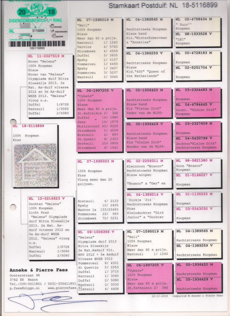 NL-18-5116899 Oryg. Anneke Pierre Faes Wnuk "Belli" x "Helena " 100% Koopman