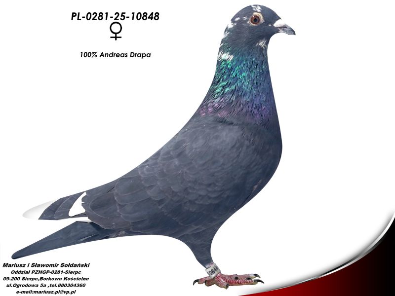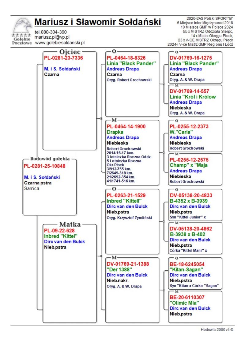 Oryginalna samica z hodowli Mariusz i Sławomir Sołdański . Gołąbek pochodzi z linii DE Leat Andreasa Drapy. Więcej informacji o gołębiu pod nr tel. i poniższych materiałach. Nasze wyniki w Mistrzostwie Polski 2018: 6 Miejsce w Intermistrzostwie Międzynarodowym - coeff. 151,73; 23 Miejsce GMP - 1874,73; 29 Miejsce Kat.B - coeff. 86,45. 1 Miejsce Gołąb Średni dystans-Konkurs Redakcji "Hodowca", 1 Miejsce Kat."B"-Konkurs Redakcji "Dobry Lot", 3 Miejsce Kat."D"-Konkurs Redakcji "Dobry Lot", 2 Miejsce "Mistrzostwo Asów Allround"-Konkurs Redakcji "Dobry Lot", 1 Miejsce Kat."B"-Konkurs Redakcji "Poradnik Hodowcy". 2019-Oddział Sierpc: Typowane Mistrz, Open I-vce Mistrz, Open 50 II-V-ce Mistrz, 1 i 3 Lotnik Roczny, Kat. A II V-ce Mistrz, Kat. B II V-ce Mistrz, Kat. D II V-ce Mistrz, Kat. GMP I v-Ce Mistrz, Kat. Inter. I V-ce Mistrz, Super. I V-ce Mistrz. Okręg Płock: II V-ce Mistrz Supermistrzostwo, I V-ce Mistrz GMP, II Lotnik. kat. B. 10 Gołębi w Reprezentacji Okręgu na Wystawę Ogółnopolską 2020. 2 AS POLSKI SPORT „B”-14,62 coef. 2020-Oddział Sierpc: Typowane Mistrz, Open I-vce Mistrz, Open 50 I-V-ce Mistrz, 1 Lotniczka Roczna, Kat. C Mistrz, Kat. M II V-ce Mistrz, Kat. D II V-ce Mistrz, Kat. GMP Mistrz, Kat. Inter. II V-ce Mistrz, Mistrz. Okręg Płock: Kat. GMP Mistrz , Kat.Roczne Mistrz, Kat. C-I Vce Mistrz , Kat. M - I Vce Mistrz Mistrz.Regionu I Łódż- V-ce Mistrz „Roczne” 2021- Supermistrz Oddziału Sierpc Mistrz Okręgu Płock Kat." Maraton" Supermistrz Okręgu Płock,2022 6 gołębi w reprezentacji Okręgu Płock na Wystawę Ogólnopolską.2022- II Supermistrz Oddziału Sierpc, 8 x V-ce Mistrz Oddziału. 1 AS WG Kaszuby 2022, 2 drużyna WG Kosakowo 2022, 4 AS WG Kosakowo. 6 AS WG Roztocze 2022. 6 gołębi w reprezentacji Okręgu Płock na Wystawę Ogólnopolską 2023. 2022-1 Samica w Polsce PL-0281-17-3077 w Kat. "Supermaraton"- Konkurs Redakcji"Hodowca". 2024 - 10 Miejsce w Polsce w kat. GMP 1 Miejsce Finał Wg Zatoka Puck 3 i 6 As Zatoka Puck