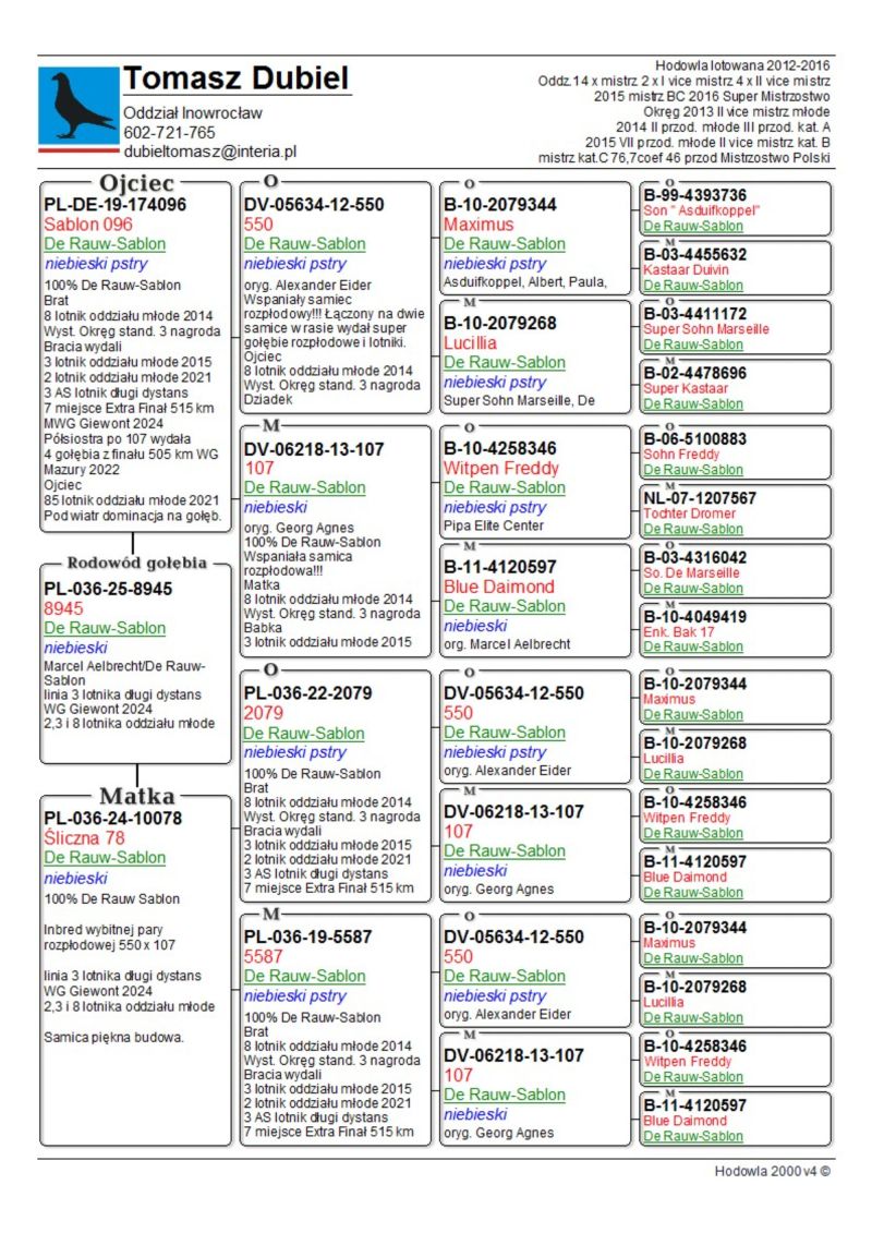 Ptaki z linii 550 x 107. Po gołębiach tych posiadam super gołębie rozpłodowe. W krótkim czasie ich dzieci jak i one same dały mi super lotniki, między innymi 2 i 3 lotnika oddziału, oraz wiele innych wartościowych lotników w lotach młodych i starych. Przepiękne gołębie na wymagające loty. Najlepsze umięśnienie, super budowa i aksamitne upierzenie. Do tego super wyniki na WG. U mnie WG Bojano 2023 wnuk 12 miejsce półfinał, 2024 wnuk 34 miejsce półfinał. U innych hodowców 2022 roku córka 107 wydała 4 gołębia z finału WG Mazury! W 2024 syn 107 x 550 wydał 3 ASA długi dystans, 7 miejsce Super Finał 515 km!!!