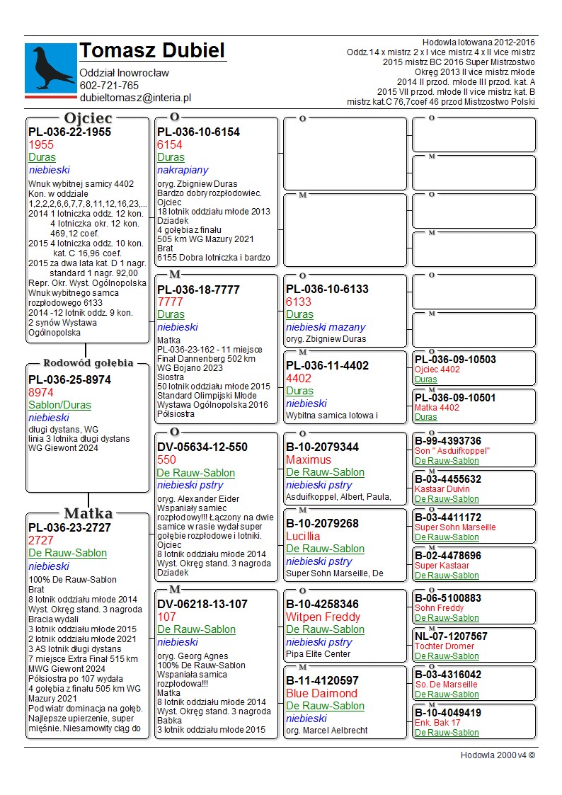 Linia 4402 najlepszego gołębia w hodowli. Sama wylatała 1 i 4 lotnika oddziału w open, w okręgu 1 lotniczka za dwa lata w kat. D. 4 lotniczka w kat. C i open. Zwyciężczyni lotu rejonowego 550 km, zdobywczyni 1 miejsca za standard w okręgu, najlepszy gołąb w drużynie Mistrza Okręgu w kat. C (9 miejsce w regionie i 49 w Polsce). W ciągu 5 lat lotowania 5 gołębi z tej linii na Wystawie Ogólnopolskiej! Jedyne ptaki które odnalazły się w każdym systemie lotowania i karmieniu. Dodam że do tej pory wysłane po jednym wnuku na WG Krakus i Giewont przeleciały całe programy + lot dodatkowy. W 2023 roku wnuk 11 na bardzo ciężkim finale 502 km na WG Bojano, U innych hodowców w 2022 roku wnuk Durasa 4 na finale WG Mazury, 2024 wnuk Durasa 16 na finale WG Roztocze. 2025 wnuk 4402 43 na extra finale WG Tatry, inny wnuk przeleciał całe Carmelo Yupi 2 x 500 km + 701 km. U kolegi Duraska inbred 4402 wydała 24 miejsce Finał Corabia One Loft Race.