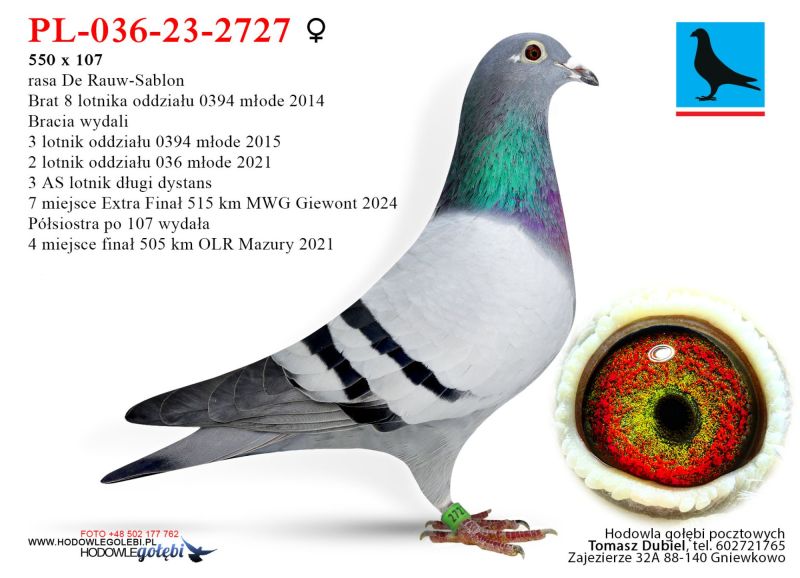 ****************************************** Moje stado opiera się na ptakach które w latach 2012-2016 pozwoliły mi wygrywać w oddziale i okręgu w różnych kategoriach, lecąc w 2 różnych oddziałach 036 i 0394. Najważniejsze osiągnięcia to Mistrz okręgu kat. C 49 miejsce w Polsce, II vice Mistrz okręgu kat. B i młode, Super Mistrz Oddziału. Wszystkie wyniki dokładnie opisane na końcu aukcji. Do lotowania wróciłem „na chwilę” w 2021 r. na nowym miejscu zamieszkania w bardzo ciężkim sezonie 3 x vice Mistrz Oddziału gołębi młodych. 2,5,11,16,19,22,23,27,28,40 pozycje w klasyfikacji lotników. 3 x Mistrz sekcji oraz XIII przodownika okręgu Bydgoszcz. Zacząłem też lotowanie na WG wysyłając po kilka sztuk na sezon. 2021 – konkursy na finałach na WG Krakus i Super Gołąb, 2022 - 14 miejsce Extra Finał 518 km WG Super Gołąb, 2023 – 11 miejsce Finał 502 km WG Bojano. 2024 - 4 miejsce Półfinał WG Tatry, WG Bojano 4 miejsce lot konkursowy, 34 miejsce Półfinał, 17 miejsce Drużyna, 54, 78, 79, 81 lotnik. Po moich gołębiach w 2024 ptaki wylatały: po pełnej parze 68 miejsce Finał Super Gołąb, po samcu 8 miejsce Extra Finał WG Warmia, po samicy 16 miejsce Finał WG Roztocze, po samcu 3 AS długi dystans i 7 miejsce Extra Finał MWG Giewont. 2025 31 lotnik Derby Carmelo Yupi, 43 miejsce Extra Finał WG Tatry, 12 miejsce Finał WG Carpatia, 40 miejsce Finał WG Krakus (56 seria na 849 hodowców 2/2 w konkursie z 3 wysłanych ptaków), po samicy ode mnie 24 miejsce Finał Corabia One Loft Race. ********************** Wszystkie gołębie przyjęły komplet szczepień(Pharmavac, salmovir + ospa). Więcej informacji w rodowodach, zapraszam też do kontaktu telefonicznego, mailowego bądź WhatsApp. ********************* TRANSPORT, ptaki zostaną dostarczone transportem prywatnym na początku grudnia, cena 1-2 szt. 100 zł, 3-6 szt. 150 zł, 7 i więcej 200 zł. Koszty transportu płatne kierowcy, za gołębie kierowcy bądź na konto, jak wygodniej. Istnieje również możliwość wcześniejszej wysyłki kurierskiej w cenie 150 zł do 6 szt. Zapraszam również do odbioru osobistego.