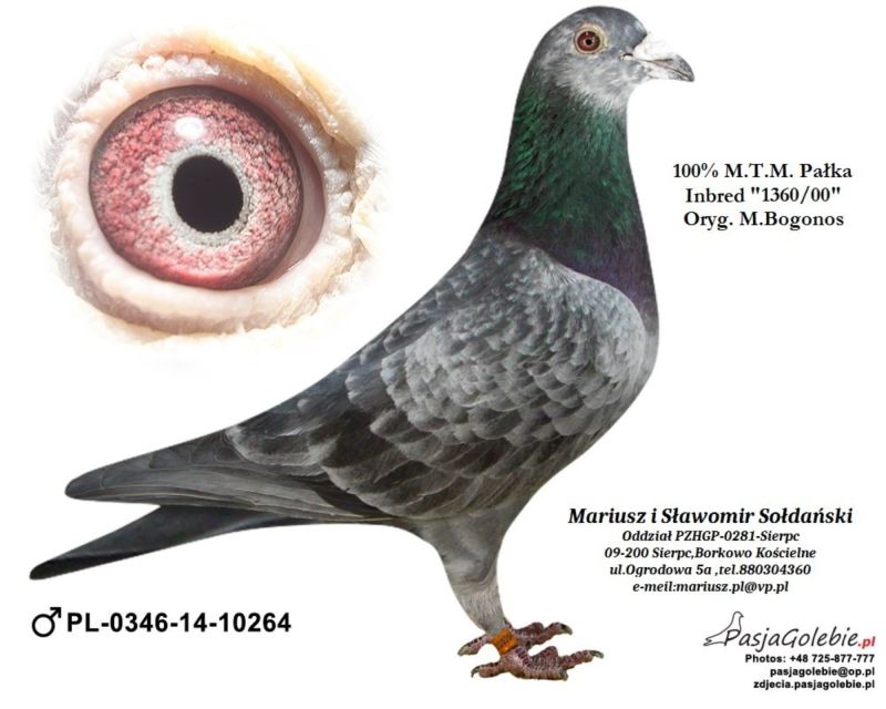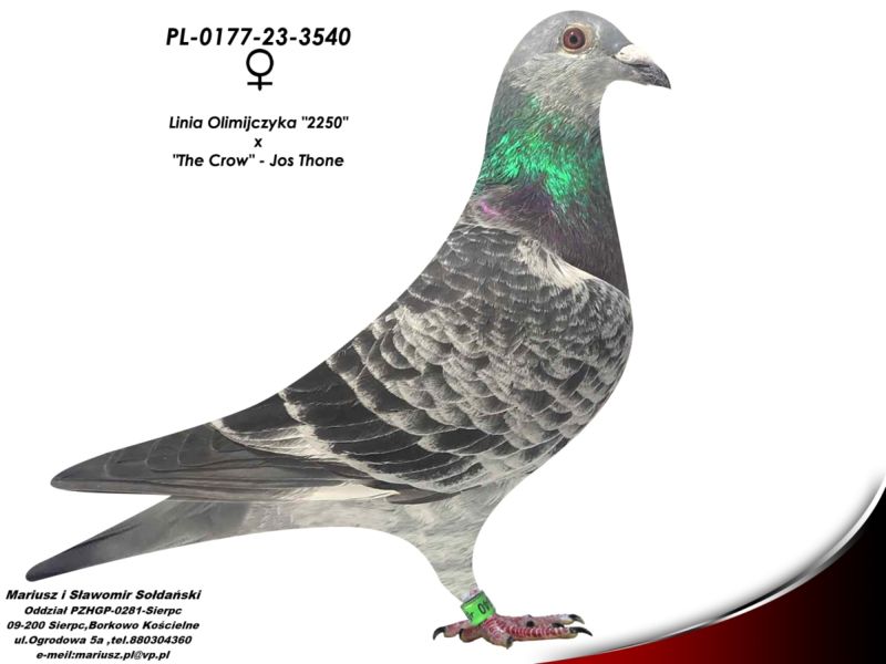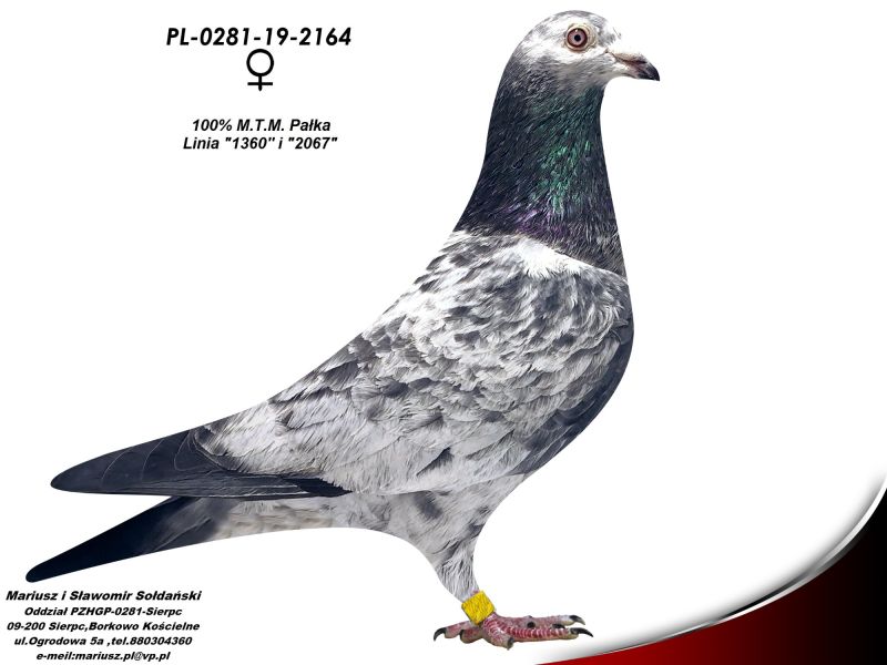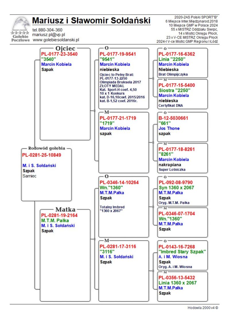 Oryginalny samiec z hodowli M. i S. Sołdańscy- Pałka x Kobiela.Więcej informacji o gołębiu pod nr tel. i poniższych materiałach. Nasze wyniki w Mistrzostwie Polski 2018: 6 Miejsce w Intermistrzostwie Międzynarodowym - coeff. 151,73; 23 Miejsce GMP - 1874,73; 29 Miejsce Kat.B - coeff. 86,45. 1 Miejsce Gołąb Średni dystans-Konkurs Redakcji "Hodowca", 1 Miejsce Kat."B"-Konkurs Redakcji "Dobry Lot", 3 Miejsce Kat."D"-Konkurs Redakcji "Dobry Lot", 2 Miejsce "Mistrzostwo Asów Allround"-Konkurs Redakcji "Dobry Lot", 1 Miejsce Kat."B"-Konkurs Redakcji "Poradnik Hodowcy". 2019-Oddział Sierpc: Typowane Mistrz, Open I-vce Mistrz, Open 50 II-V-ce Mistrz, 1 i 3 Lotnik Roczny, Kat. A II V-ce Mistrz, Kat. B II V-ce Mistrz, Kat. D II V-ce Mistrz, Kat. GMP I v-Ce Mistrz, Kat. Inter. I V-ce Mistrz, Super. I V-ce Mistrz. Okręg Płock: II V-ce Mistrz Supermistrzostwo, I V-ce Mistrz GMP, II Lotnik. kat. B. 10 Gołębi w Reprezentacji Okręgu na Wystawę Ogółnopolską 2020. 2 AS POLSKI SPORT „B”-14,62 coef. 2020-Oddział Sierpc: Typowane Mistrz, Open I-vce Mistrz, Open 50 I-V-ce Mistrz, 1 Lotniczka Roczna, Kat. C Mistrz, Kat. M II V-ce Mistrz, Kat. D II V-ce Mistrz, Kat. GMP Mistrz, Kat. Inter. II V-ce Mistrz, Mistrz. Okręg Płock: Kat. GMP Mistrz , Kat.Roczne Mistrz, Kat. C-I Vce Mistrz , Kat. M - I Vce Mistrz Mistrz.Regionu I Łódż- V-ce Mistrz „Roczne” 2021- Supermistrz Oddziału Sierpc Mistrz Okręgu Płock Kat." Maraton" Supermistrz Okręgu Płock,2022 6 gołębi w reprezentacji Okręgu Płock na Wystawę Ogólnopolską.2022- II Supermistrz Oddziału Sierpc, 8 x V-ce Mistrz Oddziału. 1 AS WG Kaszuby 2022, 2 drużyna WG Kosakowo 2022, 4 AS WG Kosakowo. 6 AS WG Roztocze 2022. 6 gołębi w reprezentacji Okręgu Płock na Wystawę Ogólnopolską 2023. 2022-1 Samica w Polsce PL-0281-17-3077 w Kat. "Supermaraton"- Konkurs Redakcji"Hodowca". 2024 - 10 Miejsce w Polsce w kat. GMP 1 Miejsce Finał Wg Zatoka Puck 3 i 6 As Zatoka Puck