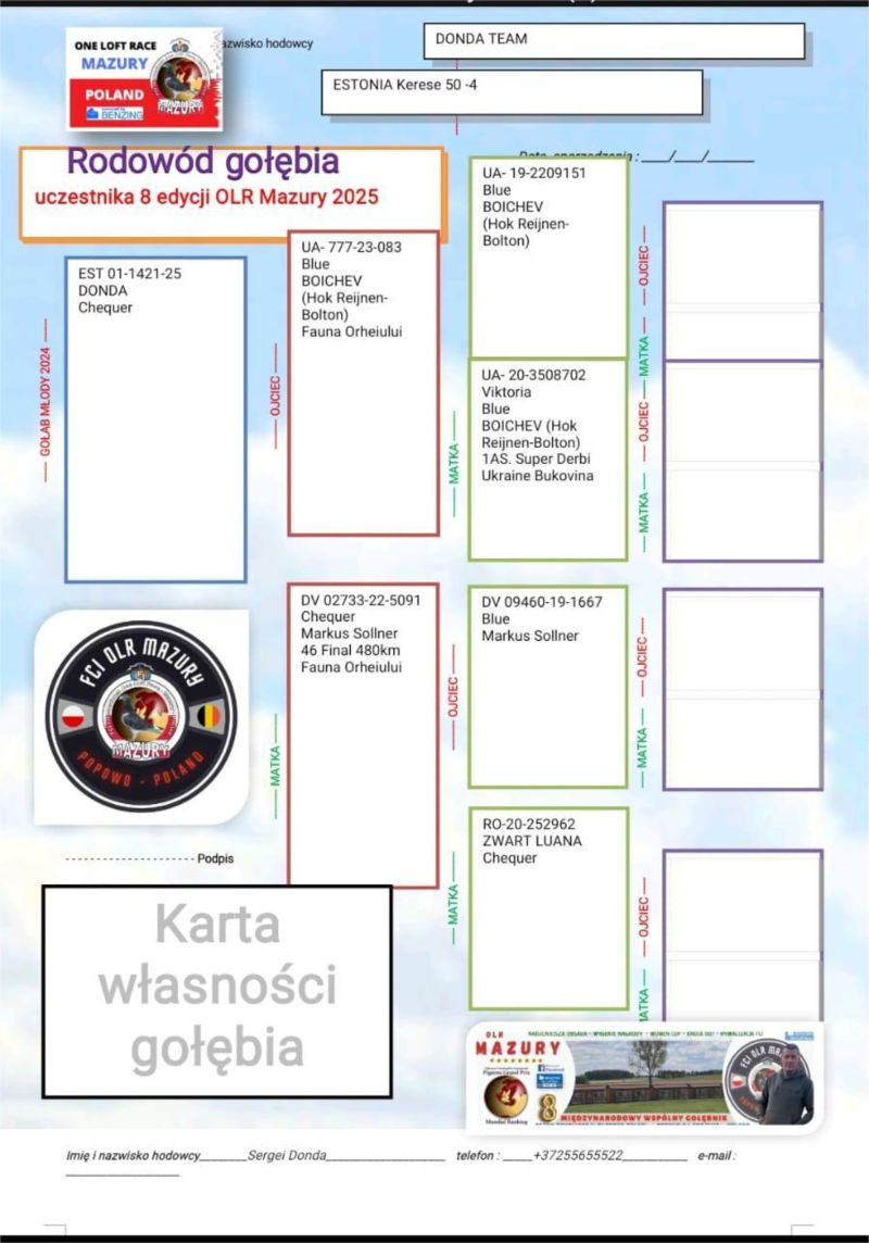 Płeć: młody gołąb Hodowca - rasa: Wojciechowski K. & Donda Sergei (Estonia) Zakończenie: 20.11.2025 godz. 20:42